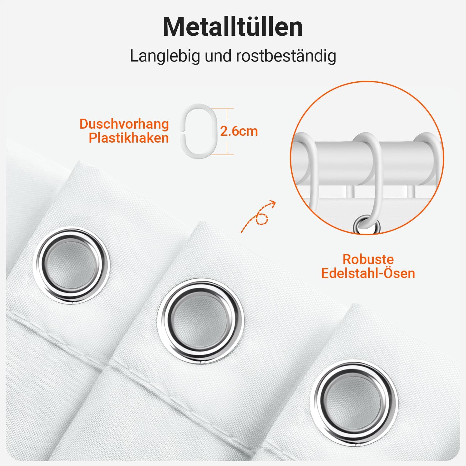 • Лесен монтаж: Тази завеса за душ е снабдена с 12 пластмасови кукички, включените кукички позволяват лесно окачване на тази завеса за баня. Долен подгъв с тежести: Допълнителен шев с надеждно закрепен подгъв в долната част. Включете струята под високо налягане. Предотвратете залепването на завесата за баня по тялото ви, когато се къпете.