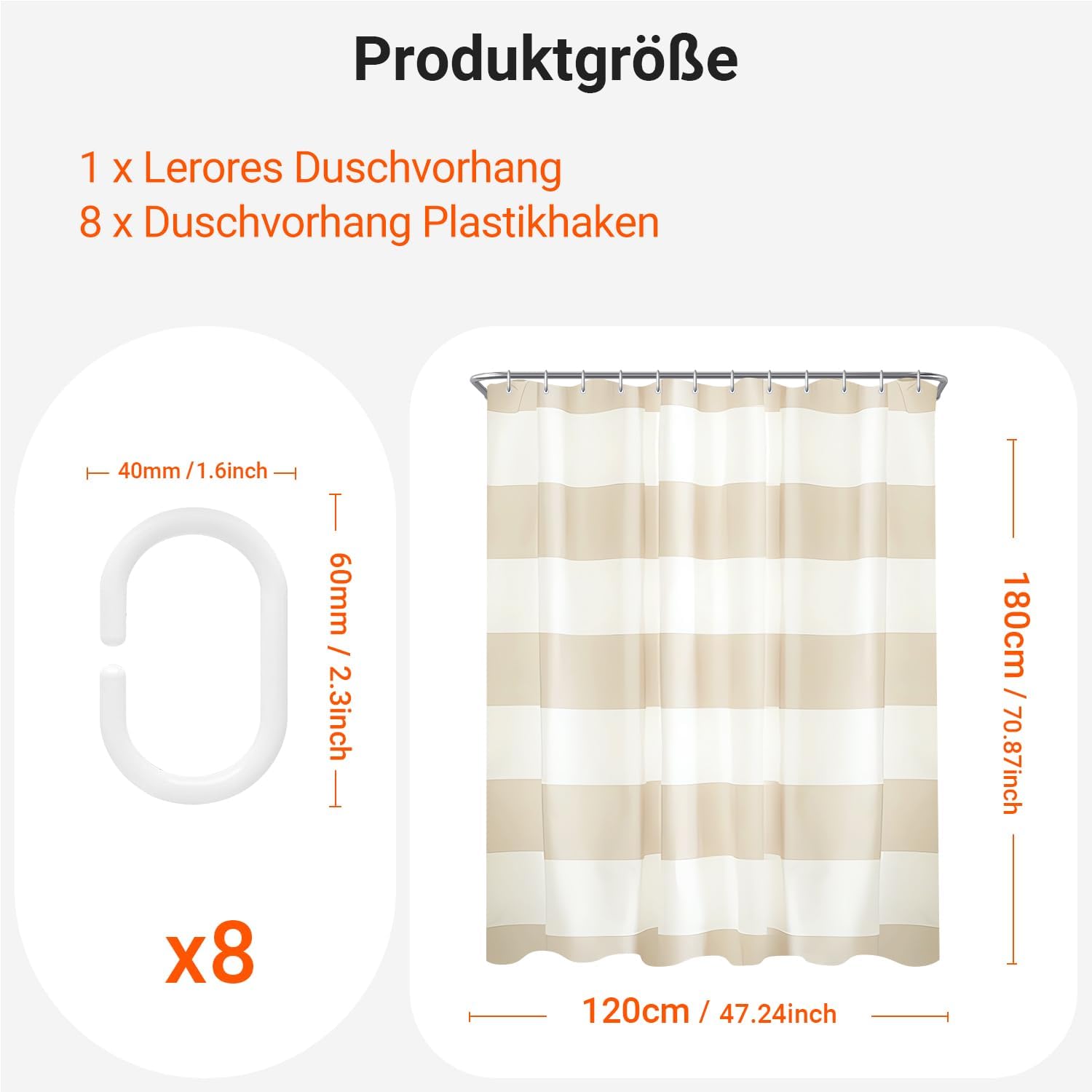 Завеса за душ, 120 x 180 см, бежови райета, утежнен подгъв, текстил против мухъл, водоотблъскващ, перащи се полиестерни завеси за баня с капси и 8 халки за душ за баня, вана