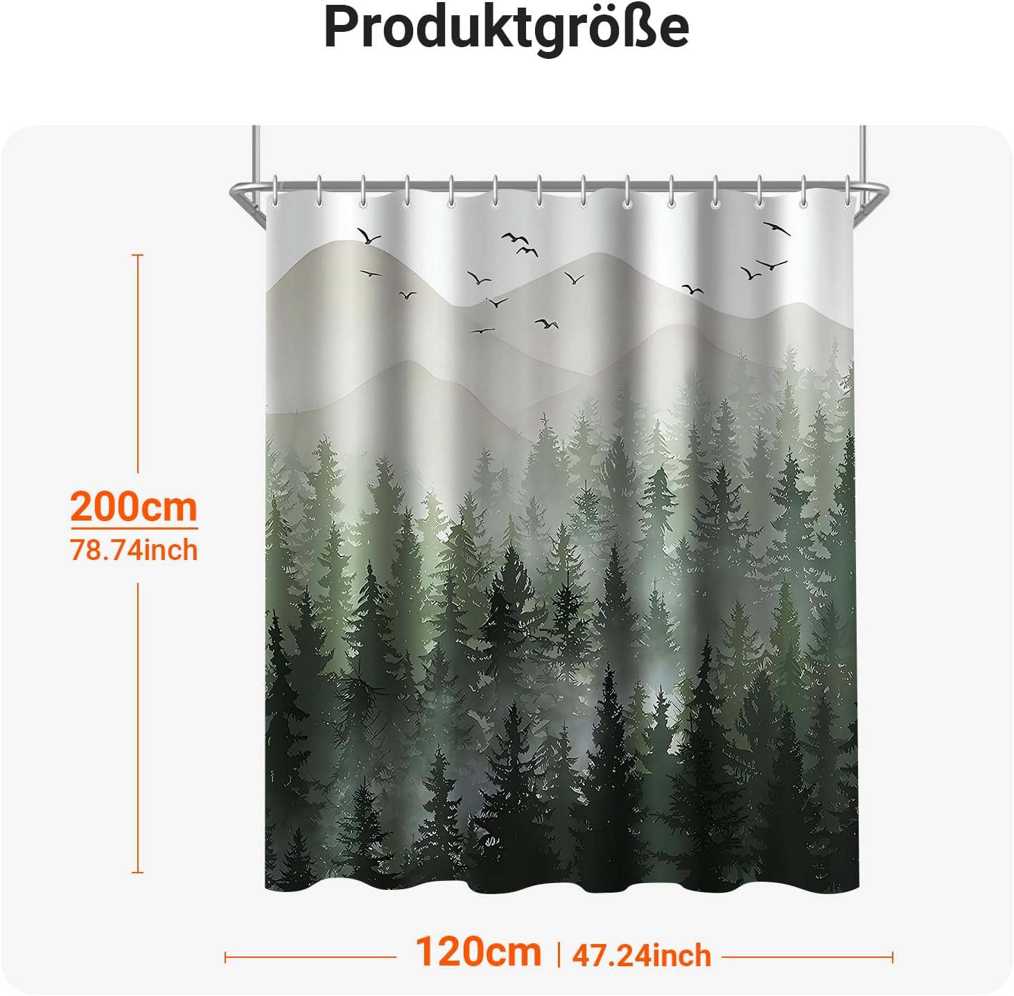 Завеса за душ 120 x 200 см, гора, текстил против мухъл, утежнен подгъв, водоотблъскваща, переща се полиестерна материя, завеса за баня с 8 отвора и халки за душ, подходяща за баня, вана