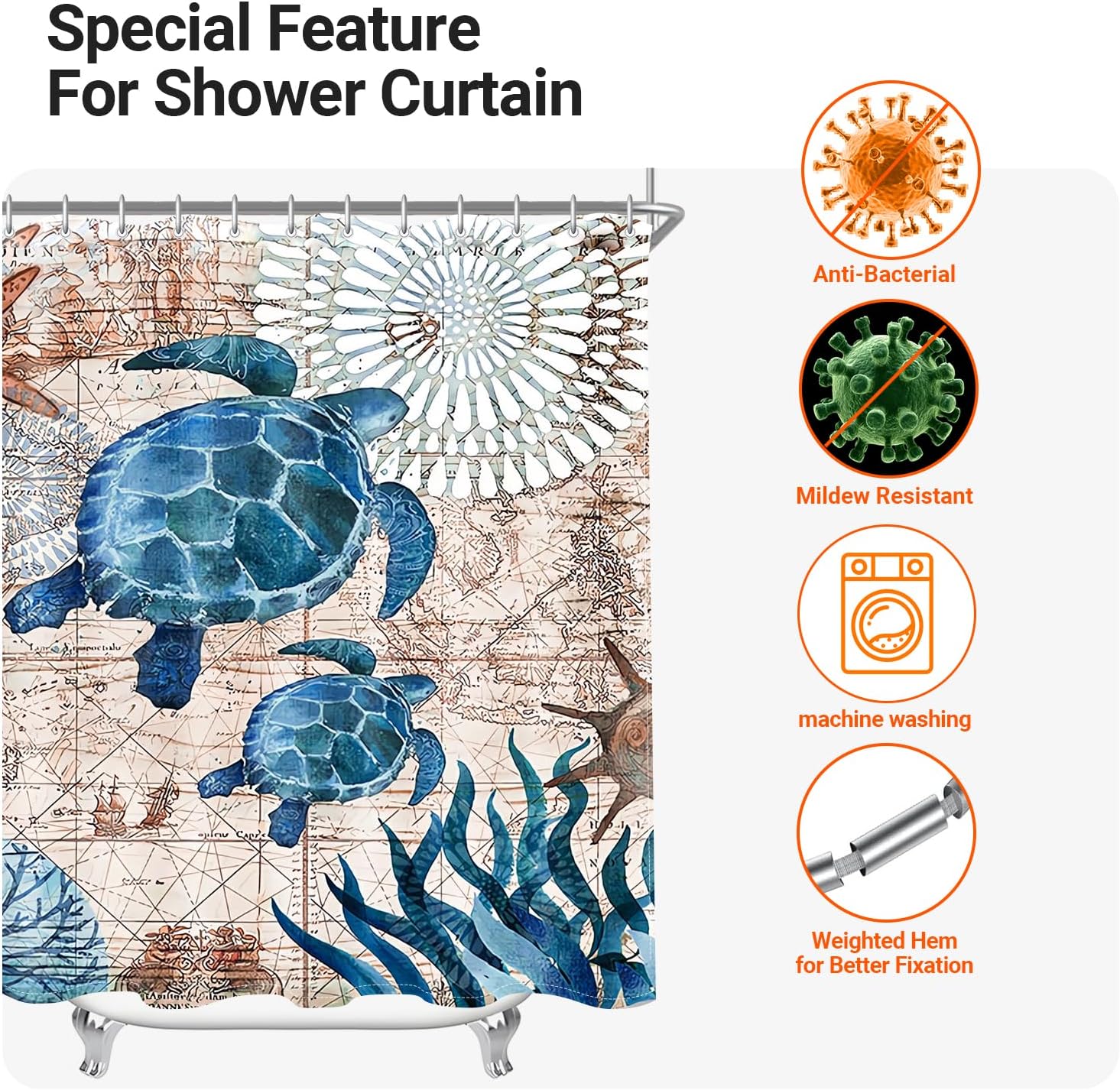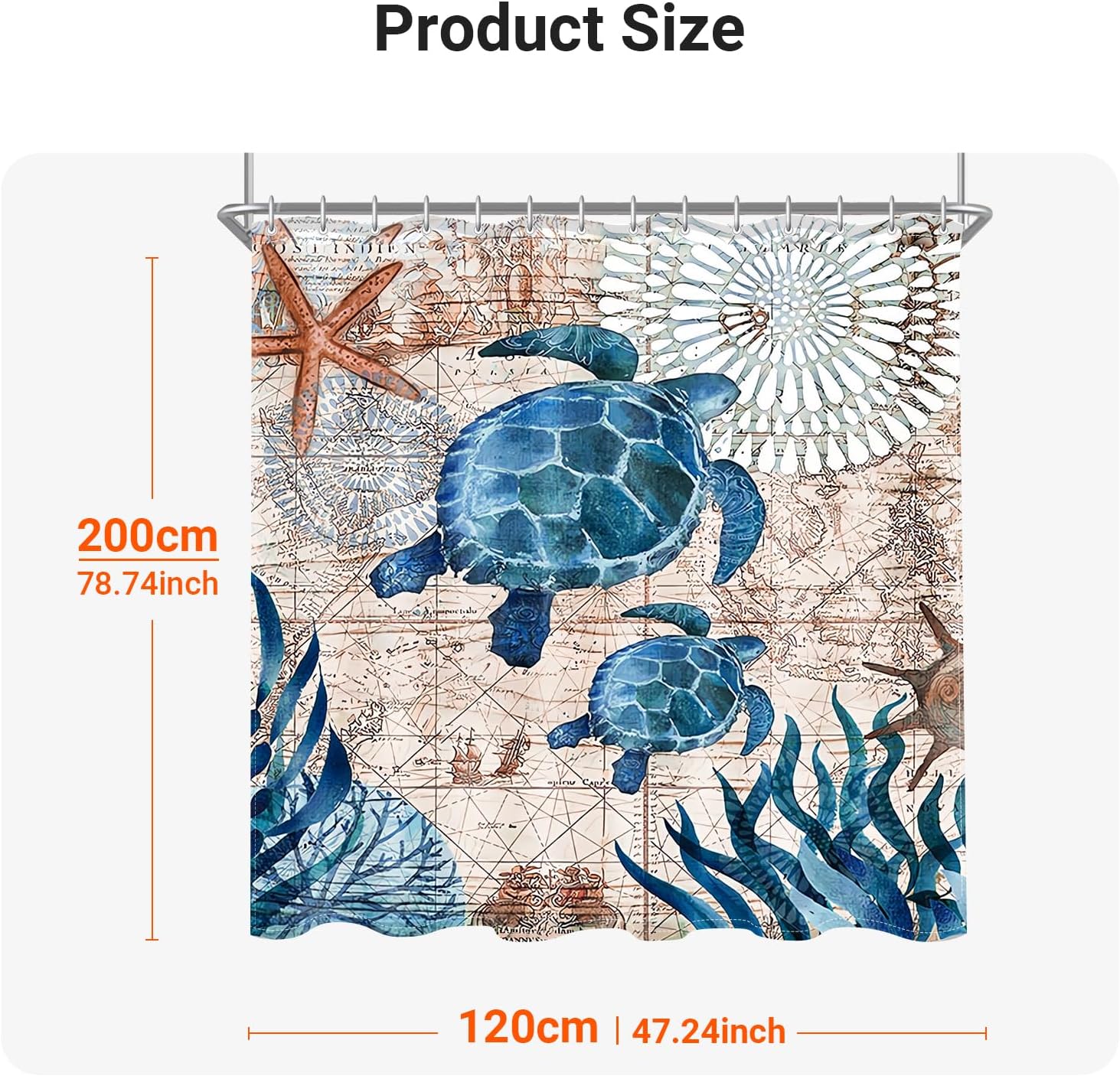 Завеса за душ, 120 x 200 см, Морска костенурка, Утежнен подгъв, Против мухъл, Водоотблъскваща, Переща се полиестерна материя, Завеса за баня с капси и 8 халки за душ за баня, Вана