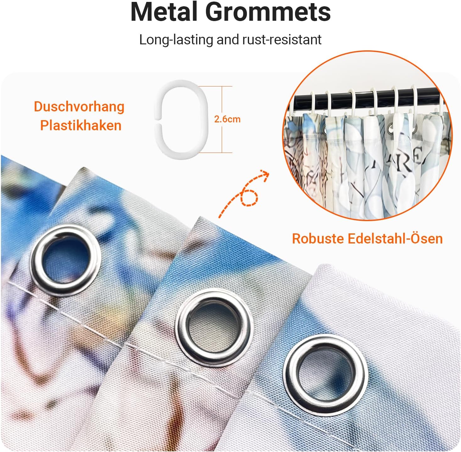 • Лесен монтаж: Тази завеса за душ е снабдена с 12 пластмасови кукички, включените кукички позволяват лесно окачване на тази завеса за баня. Долен подгъв с тежести: Допълнителен шев с надеждно закрепен подгъв в долната част. Включете струята под високо налягане. Предотвратете залепването на завесата за баня по тялото ви, когато се къпете.
