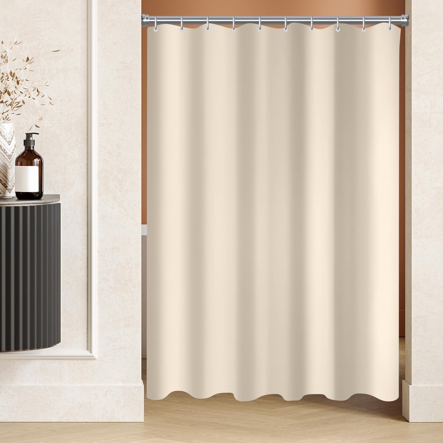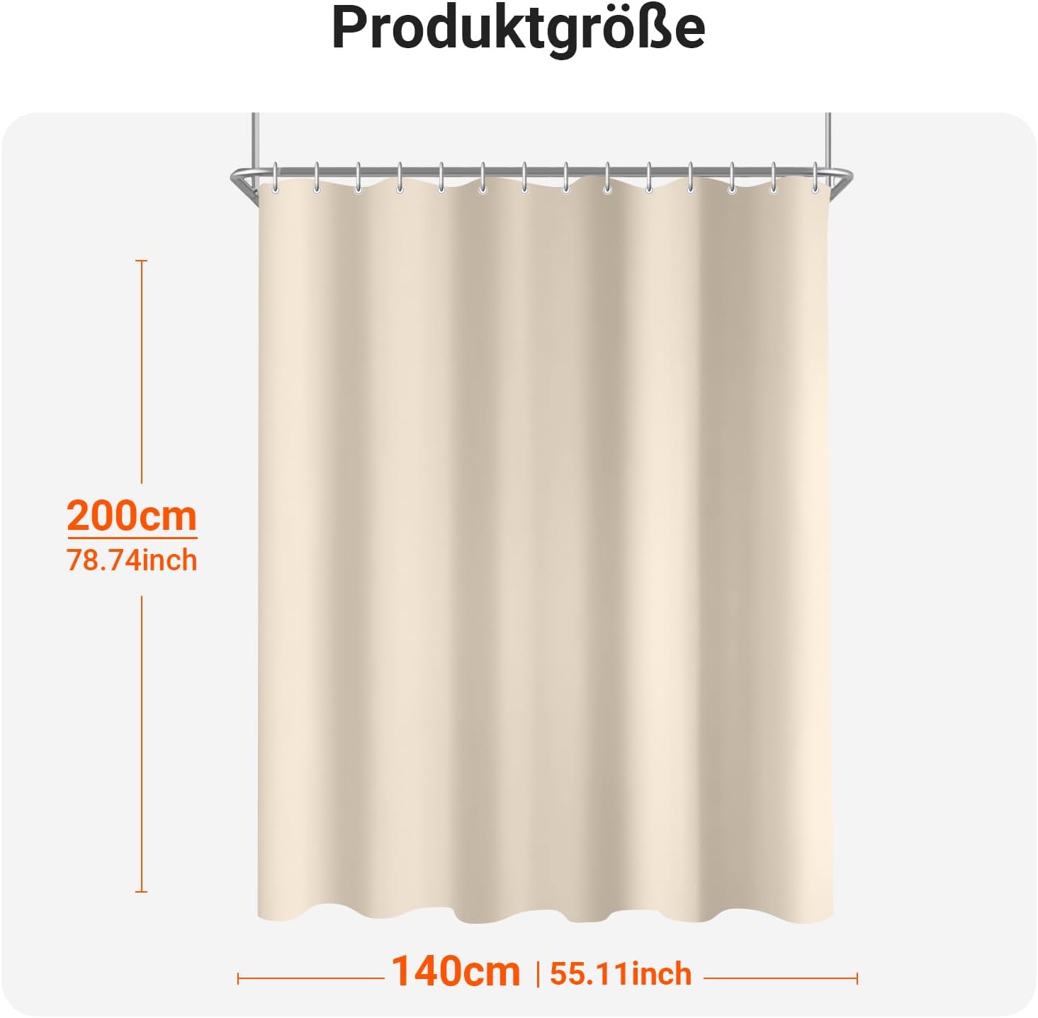 Завеса за душ, 140 x 200 см, бежова, утежнен подгъв, текстил против мухъл, водоотблъскващ, полиестерна материя, която може да се пере, завеса за баня, вана с 10 халки за завеса за душ