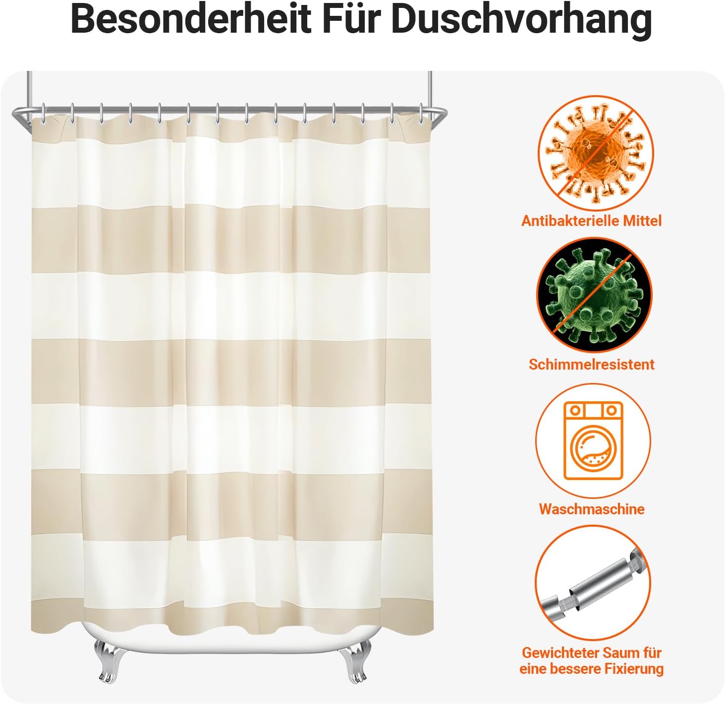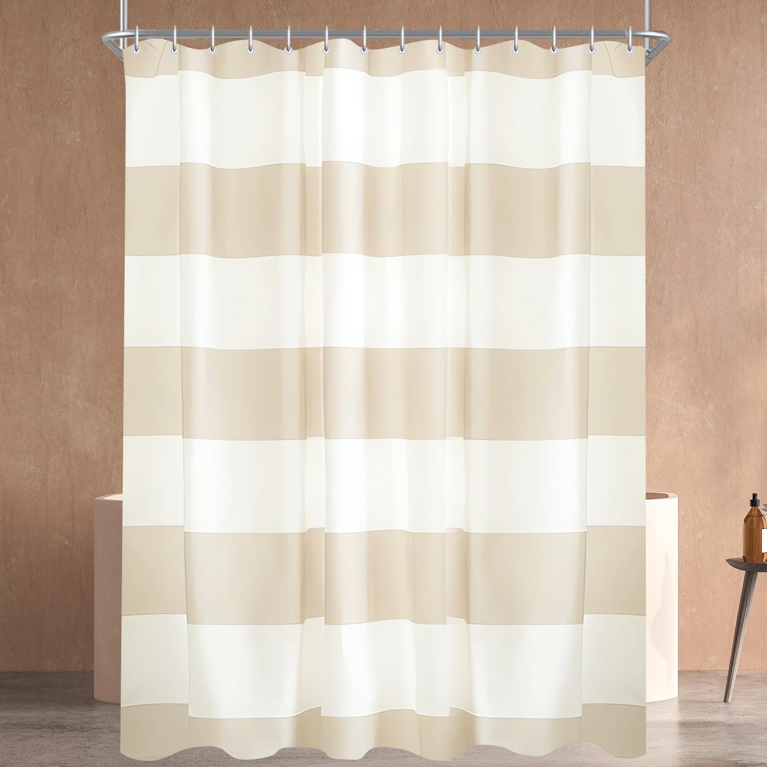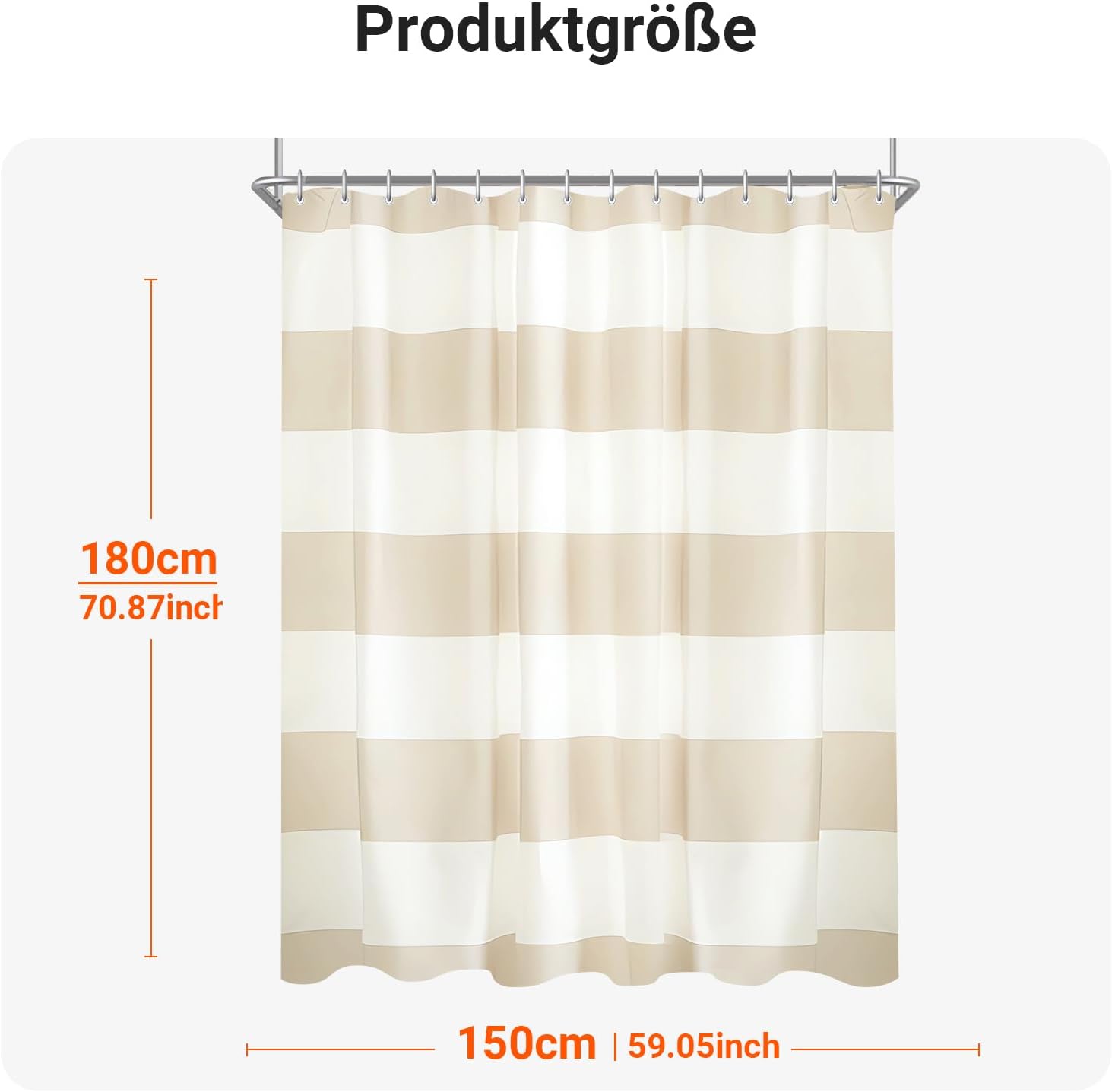 Завеса за душ, 150 x 180 см, бежови райета, утежнен подгъв, текстил против мухъл, водоотблъскващ, перащи се полиестерни завеси за баня с капси и 12 халки за душ за баня, вана