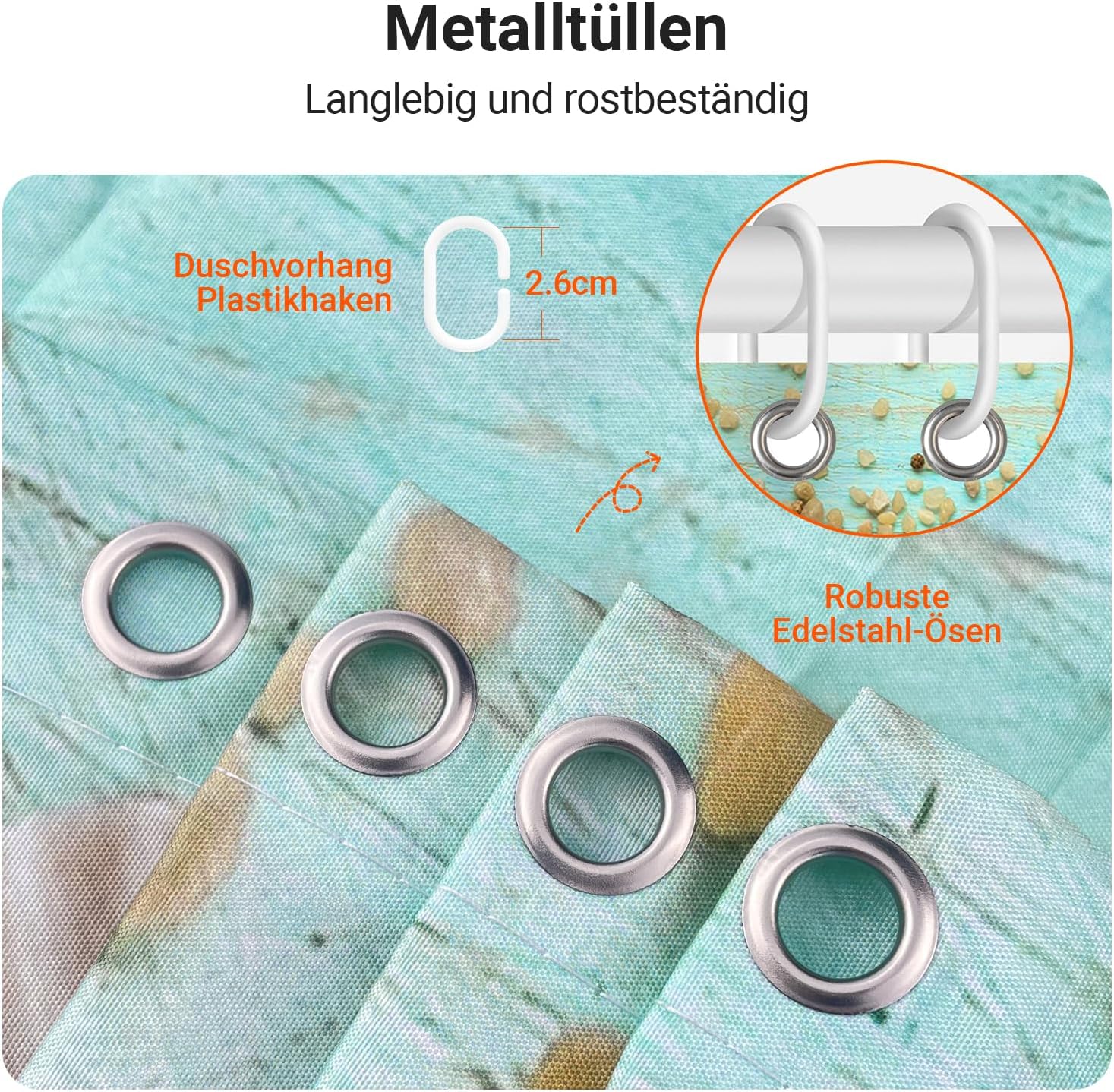 • Лесен монтаж: Тази завеса за душ е снабдена с 12 пластмасови кукички, включените кукички позволяват лесно окачване на тази завеса за баня. Долен подгъв с тежести: Допълнителен шев с надеждно закрепен подгъв в долната част. Включете струята под високо налягане. Предотвратете залепването на завесата за баня по тялото ви, когато се къпете.
