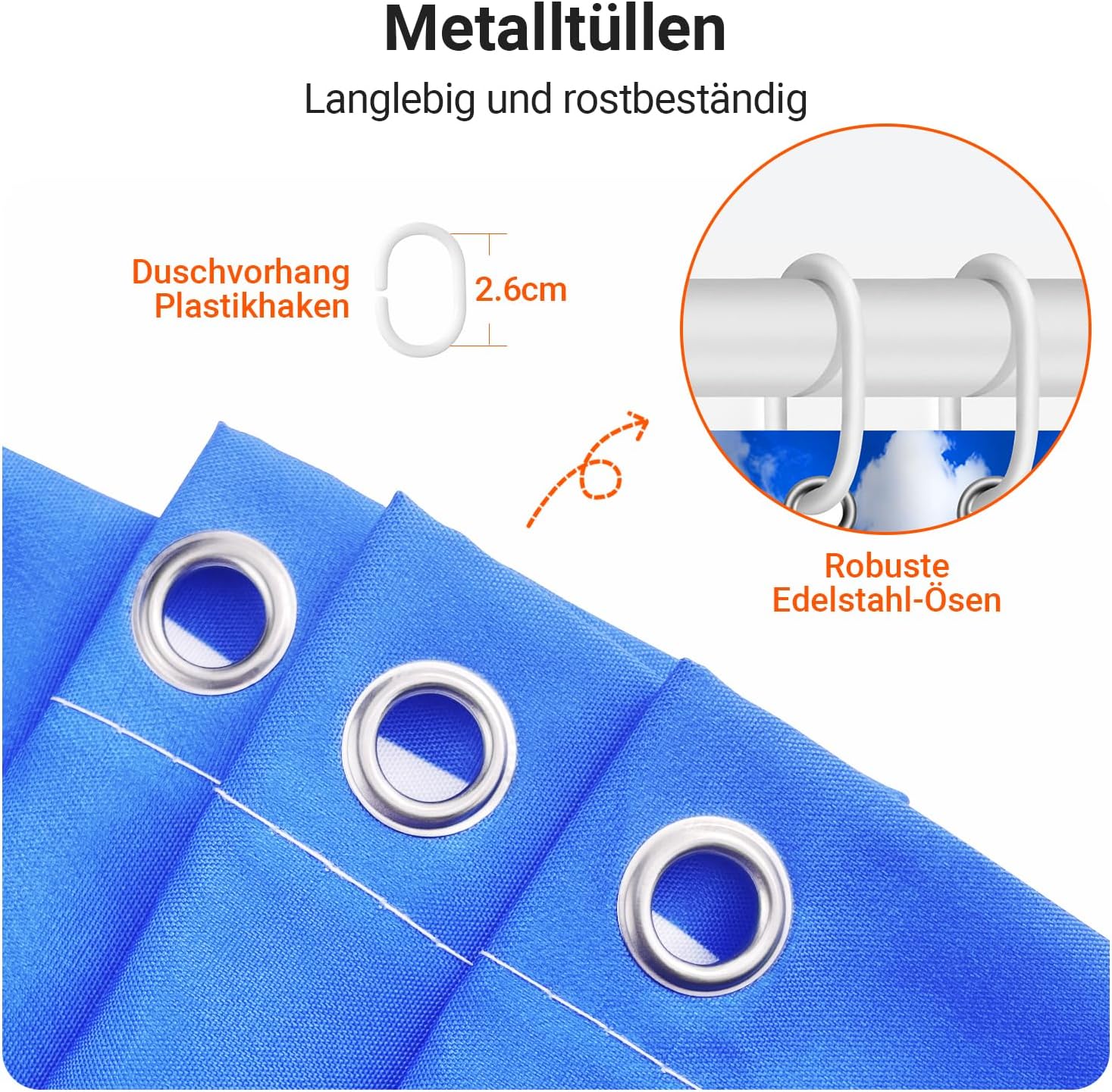 • Лесен монтаж: Тази завеса за душ е снабдена с 12 пластмасови кукички, включените кукички позволяват лесно окачване на тази завеса за баня. Долен подгъв с тежести: Допълнителен шев с надеждно закрепен подгъв в долната част. Включете струята под високо налягане. Предотвратете залепването на завесата за баня по тялото ви, когато се къпете.