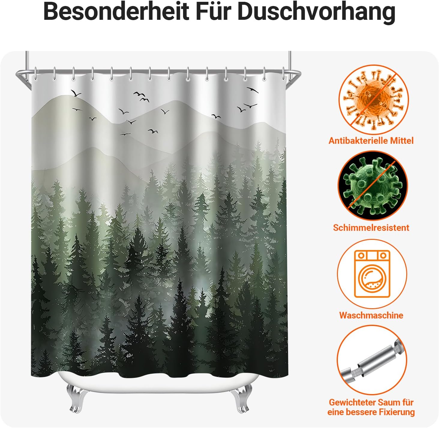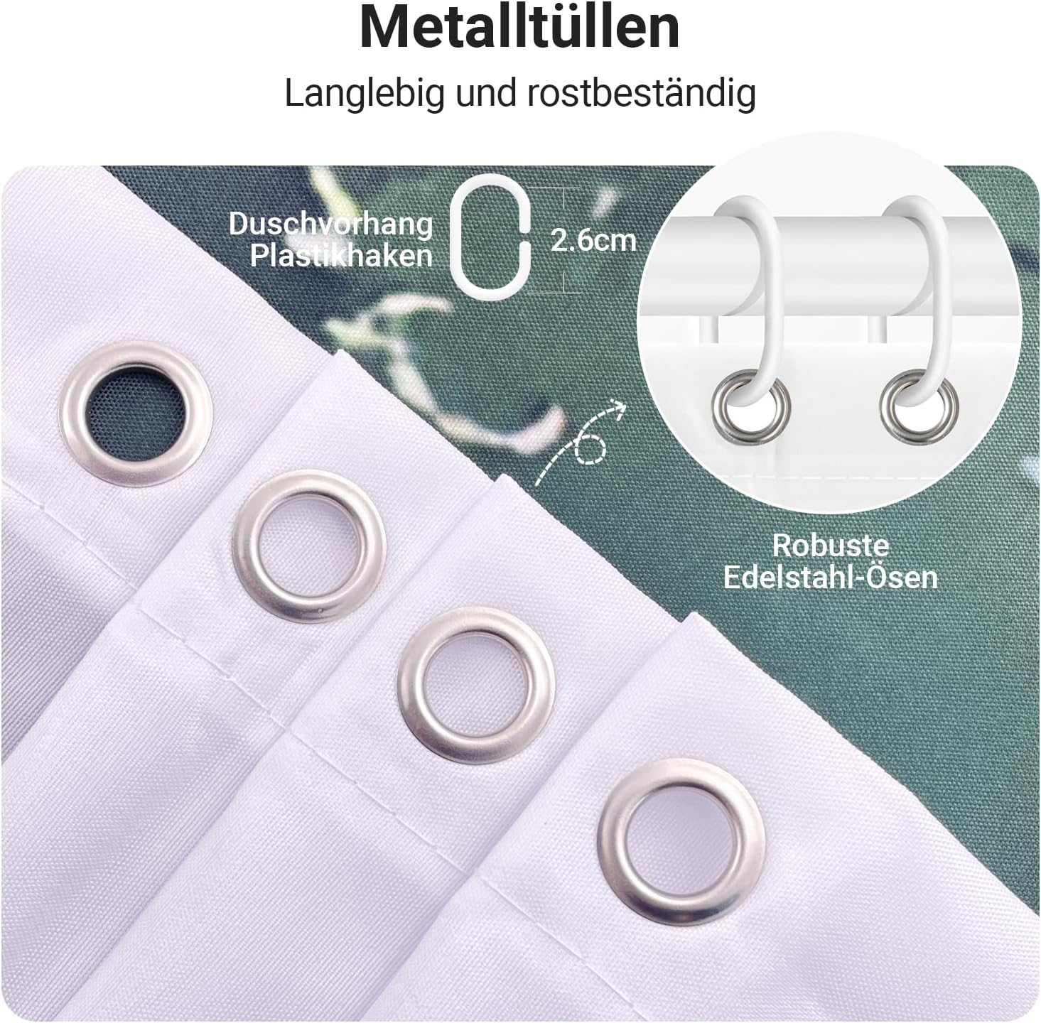 • Лесен монтаж: Тази завеса за душ е снабдена с 12 пластмасови кукички, включените кукички позволяват лесно окачване на тази завеса за баня. Долен подгъв с тежести: Допълнителен шев с надеждно закрепен подгъв в долната част. Включете струята под високо налягане. Предотвратете залепването на завесата за баня по тялото ви, когато се къпете.