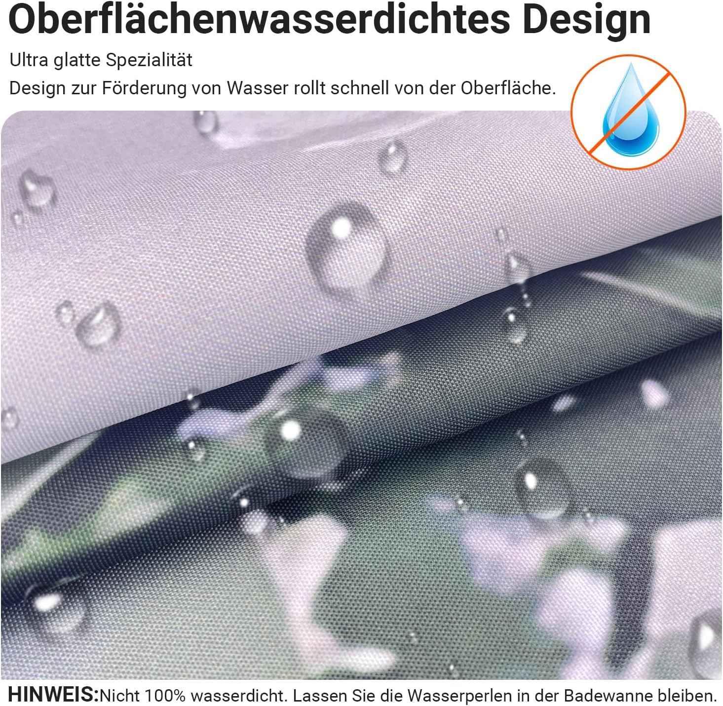 • Противомушълно и водоустойчиво покритие: Ултрагладък специален дизайн, създаден да устои на вода и да насърчава образуването на водни капчици, водата може лесно да се образува върху завесата за душ. За да предотвратите образуването на мухъл, уверете се, че водните капчици остават във ваната. Не е 100% водоустойчиво.