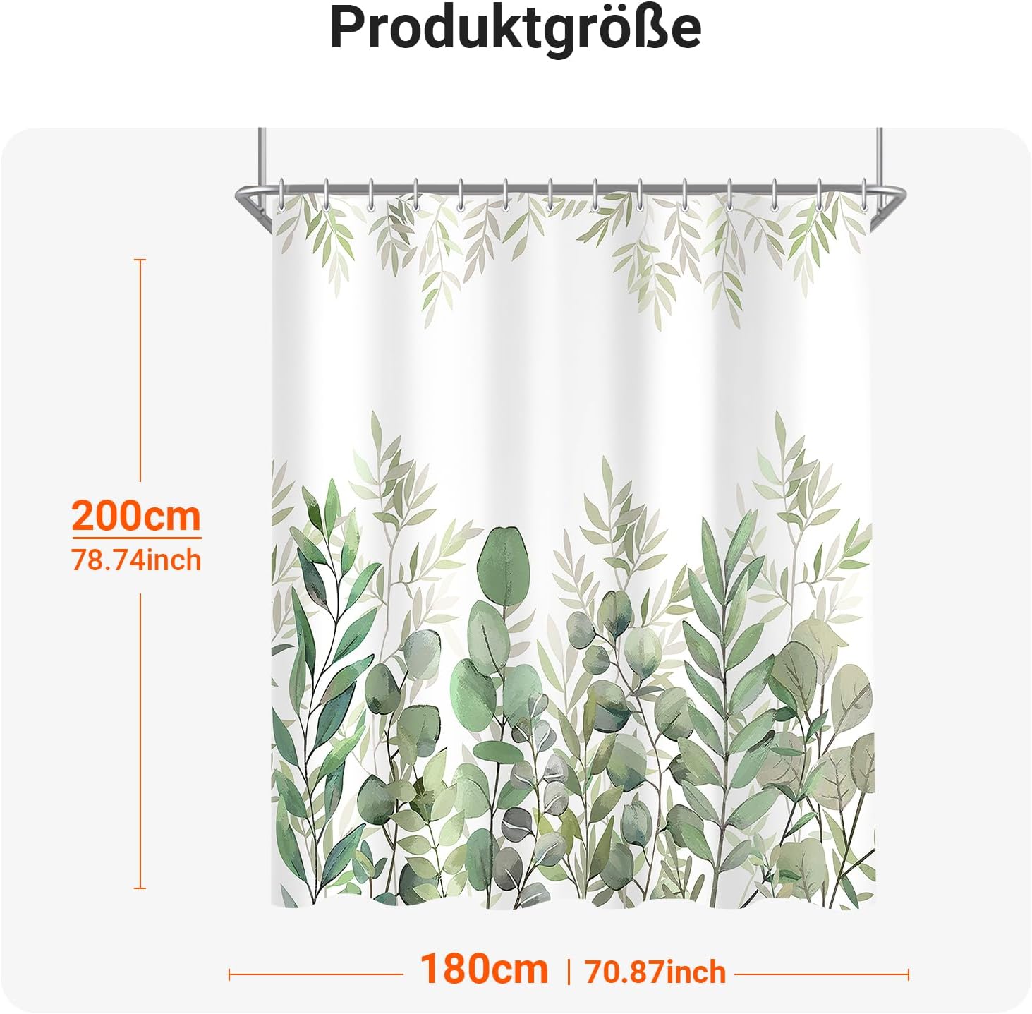 Завеса за душ, 180 x 200 см, Листа, Утежнен подгъв, Текстил против мухъл, Водоустойчива повърхност, Полиестерна материя, която може да се пере, Завеси за баня, Вана с 12 халки за завеса за душ