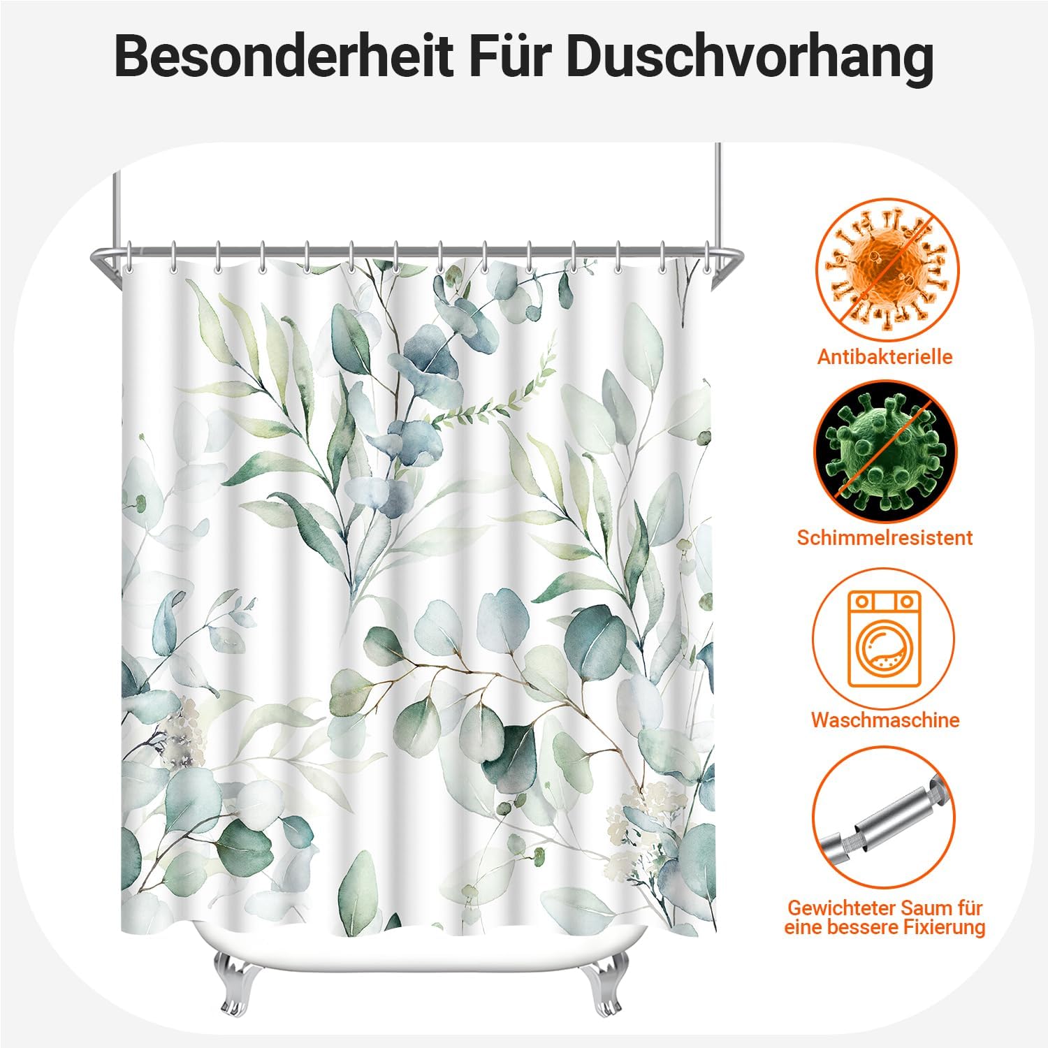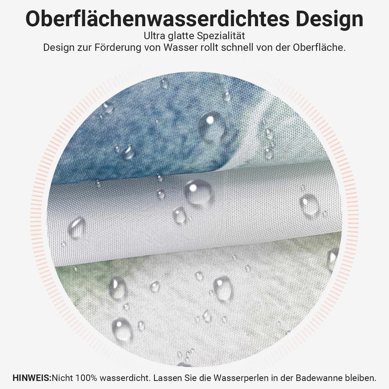• Противомушълно и водоустойчиво покритие: Ултрагладък специален дизайн, създаден да устои на вода и да насърчава образуването на водни капчици, водата може лесно да се образува върху завесата за душ. За да предотвратите образуването на мухъл, уверете се, че водните капчици остават във ваната. Не е 100% водоустойчиво.
