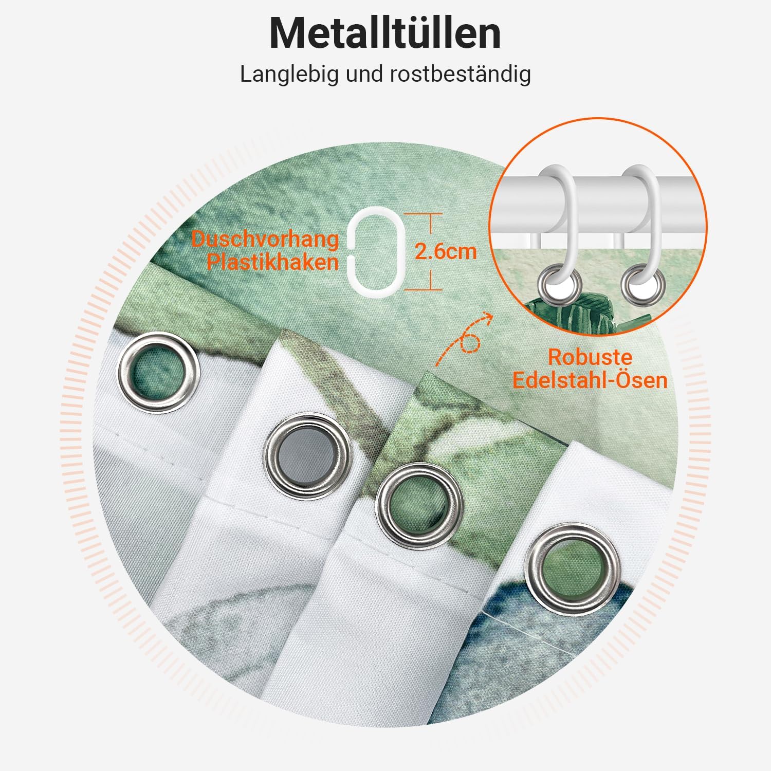 • Лесен монтаж: Тази завеса за душ е снабдена с 12 пластмасови кукички, включените кукички позволяват лесно окачване на тази завеса за баня. Долен подгъв с тежести: Допълнителен шев с надеждно закрепен подгъв в долната част. Включете струята под високо налягане. Предотвратете залепването на завесата за баня по тялото ви, когато се къпете.