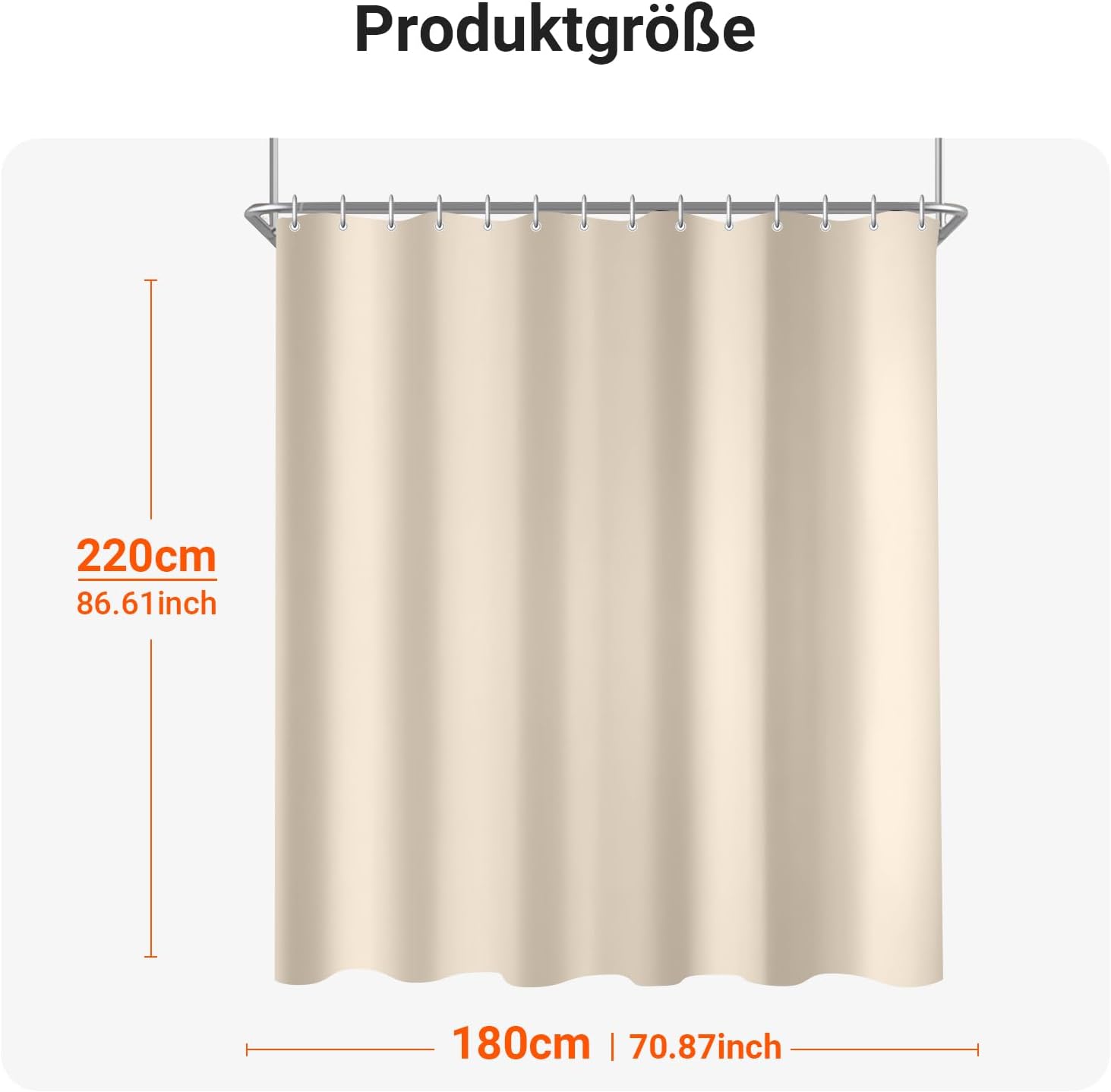 Завеса за душ, 180 x 220 см, бежова, утежнен подгъв, текстил против мухъл, водоотблъскващ, полиестерна материя, която може да се пере, завеса за баня, вана с 12 халки за завеса за душ