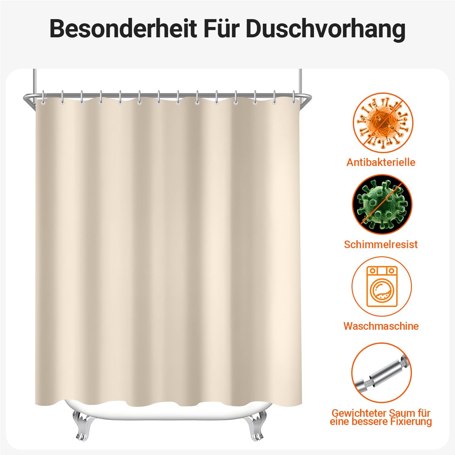 • Лесен монтаж: Тази завеса за душ е снабдена с 12 пластмасови кукички, включените кукички позволяват лесно окачване на тази завеса за баня. Долен подгъв с тежести: Допълнителен шев с надеждно закрепен подгъв в долната част. Включете струята под високо налягане. Предотвратете залепването на завесата за баня по тялото ви, когато се къпете.