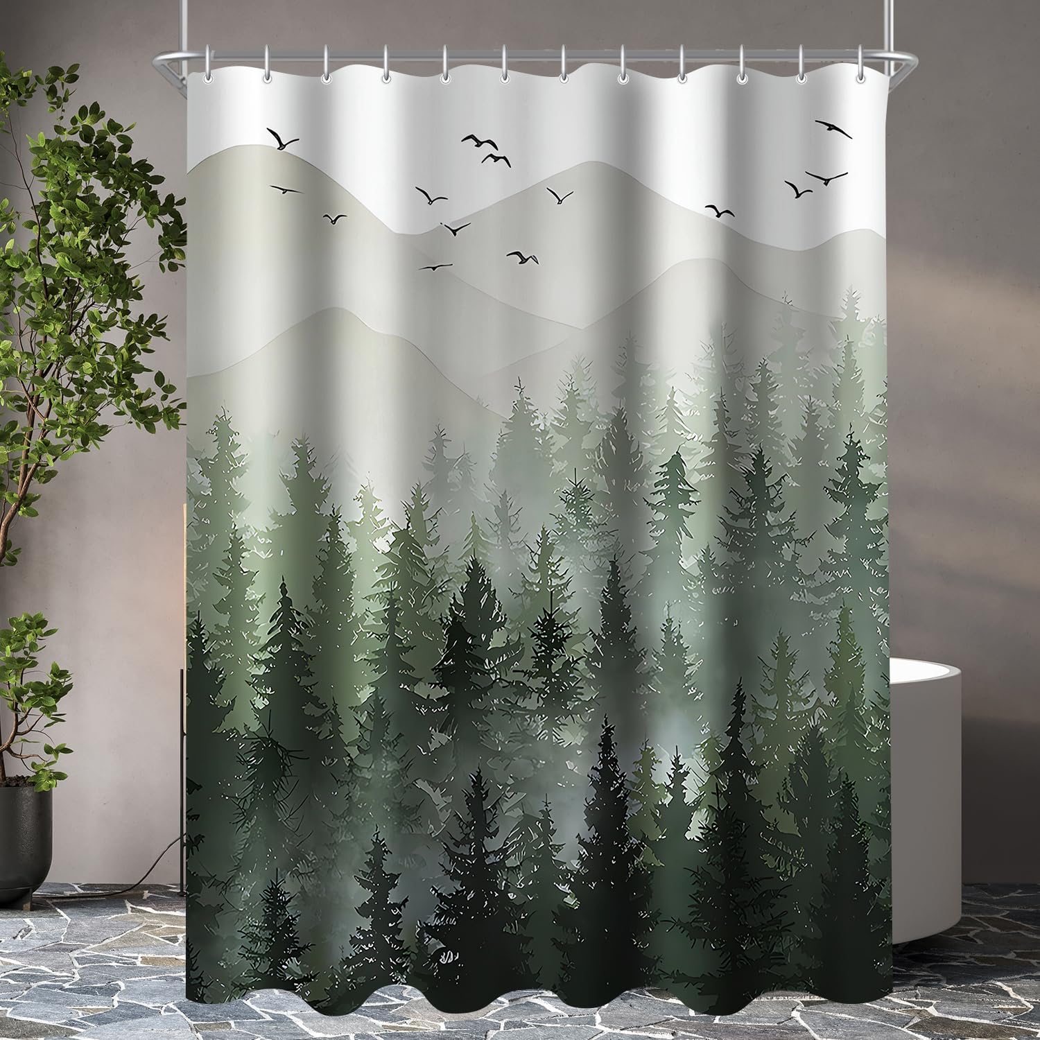 Завеса за душ 200 x 160 см, текстил Forest Anti-Mold, утежнен подгъв, водоотблъскваща, переща се полиестерна материя, завеса за баня с 12 капси и халки за душ, подходяща за баня и вана