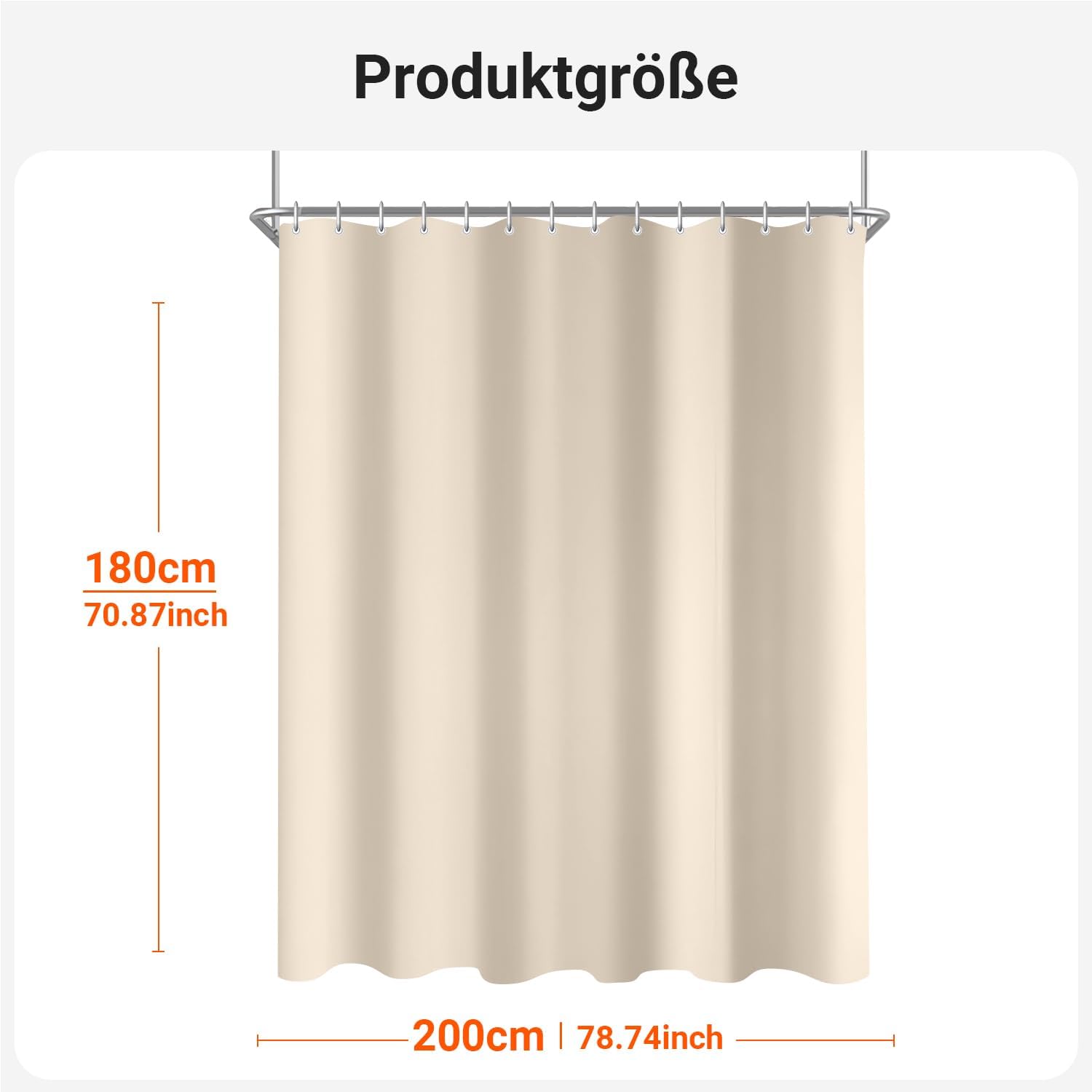 Завеса за душ, 200 x 180 см, бежова, с утежнен подгъв, текстил против мухъл, водоотблъскващ, полиестерна материя, която може да се пере, завеса за баня, вана с 12 халки за завеса за душ