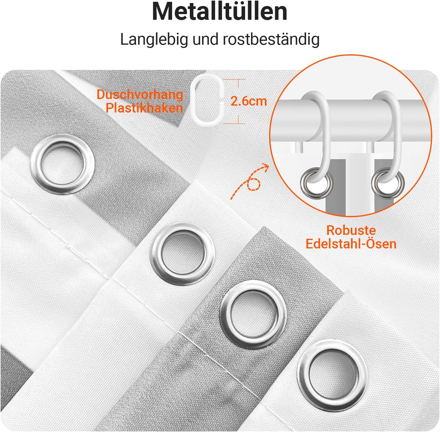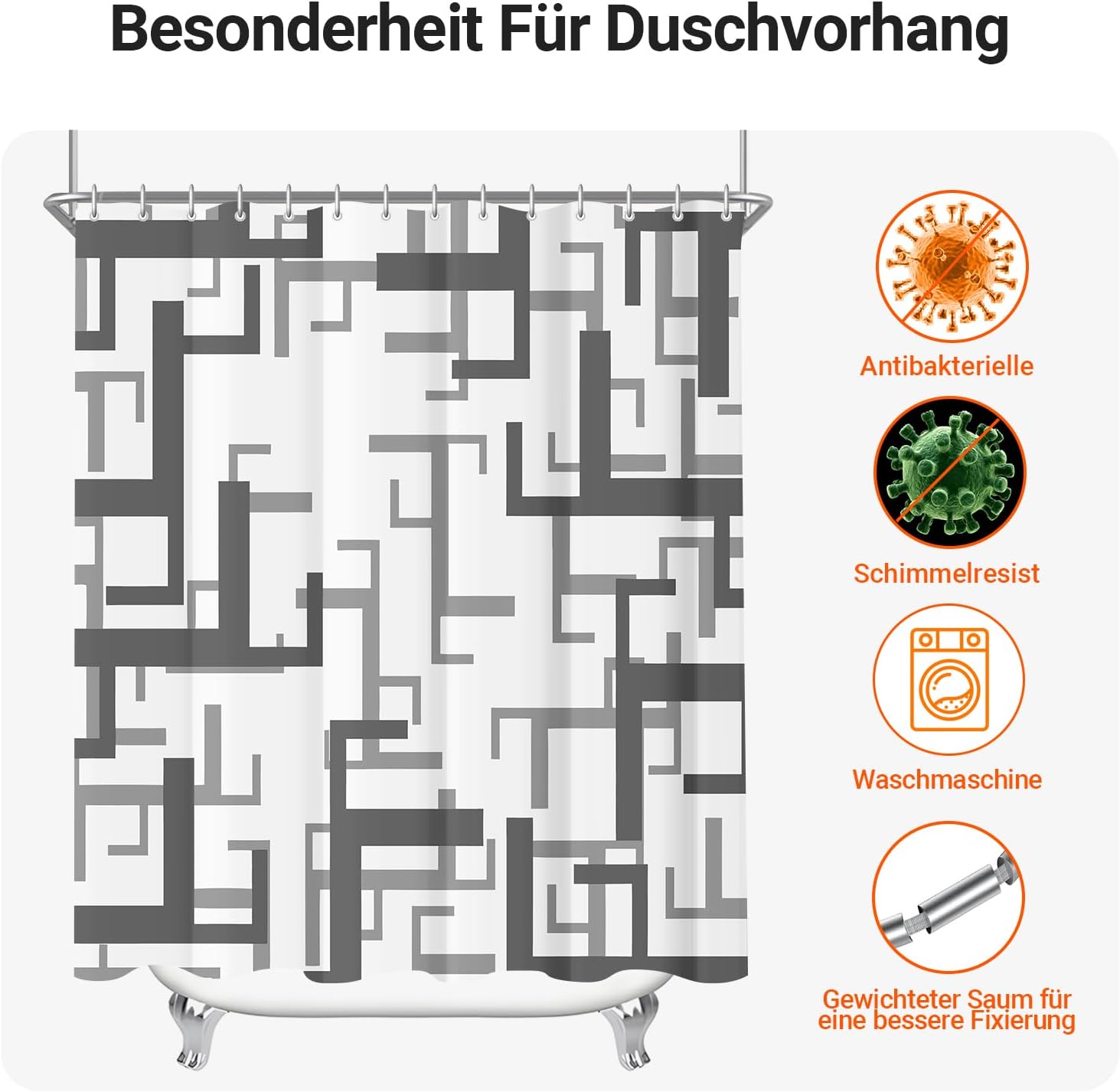 • Лесен монтаж: Тази завеса за душ е снабдена с 12 пластмасови кукички, включените кукички позволяват лесно окачване на тази завеса за баня. Долен подгъв с тежести: Допълнителен шев с надеждно закрепен подгъв в долната част. Включете струята под високо налягане. Предотвратете залепването на завесата за баня по тялото ви, когато се къпете.