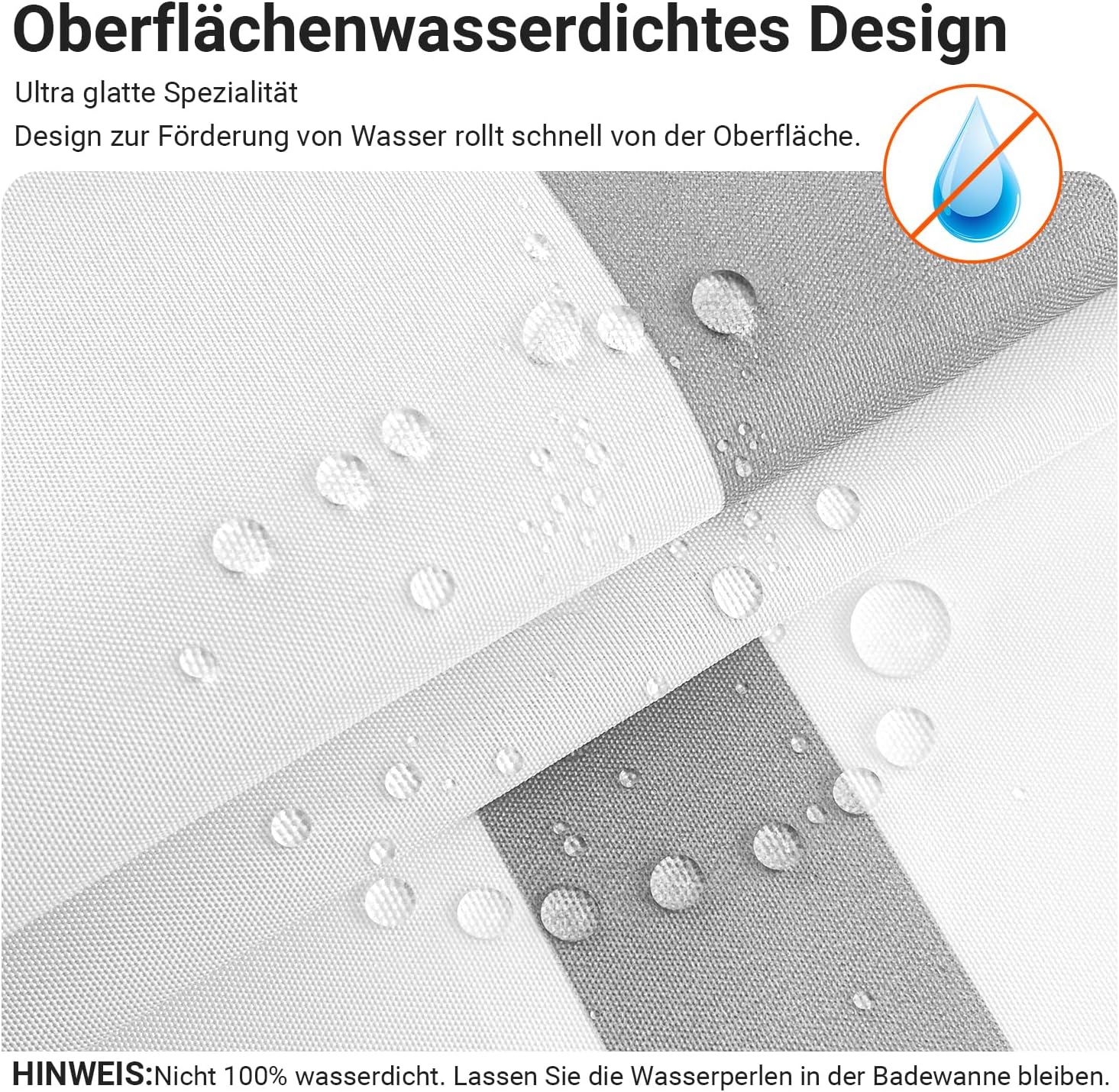 • Противомушълно и водоустойчиво покритие: Ултрагладък специален дизайн, създаден да устои на вода и да насърчава образуването на водни капчици, водата може лесно да се образува върху завесата за душ. За да предотвратите образуването на мухъл, уверете се, че водните капчици остават във ваната. Не е 100% водоустойчиво.