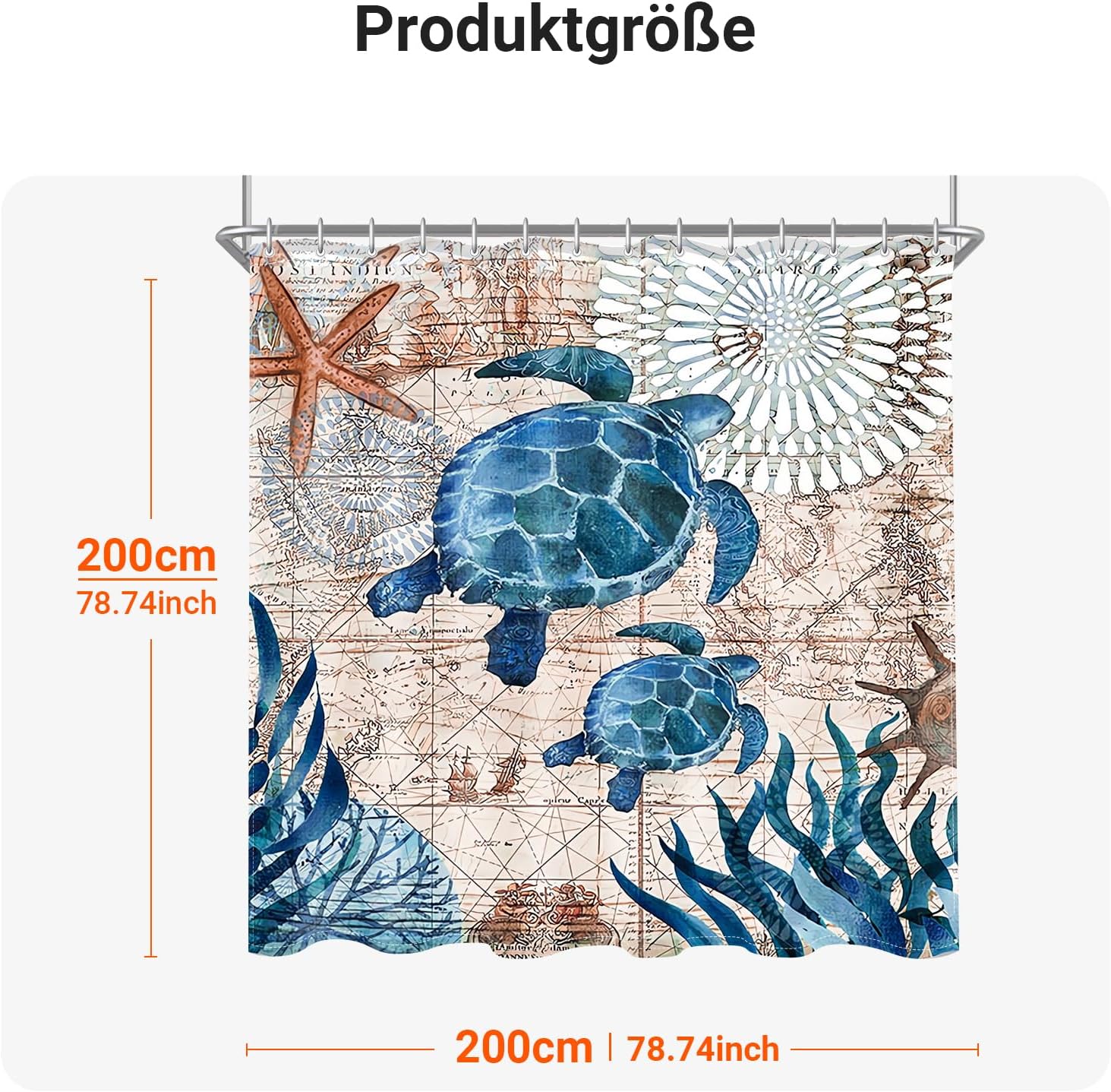 Завеса за душ, 200 x 200 см, Морска костенурка, Утежнен подгъв, Против мухъл, Водоотблъскваща, Переща се полиестерна материя, Завеса за баня с капси и 12 халки за душ за баня, Вана