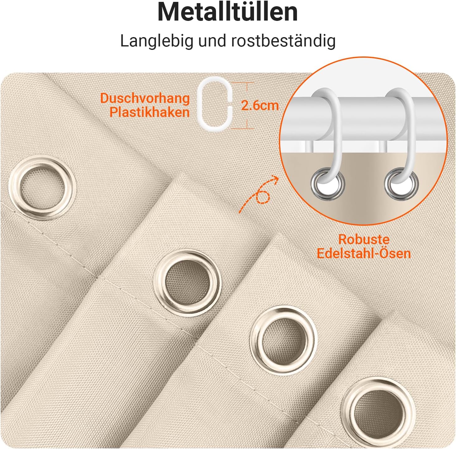 Завеса за душ, 210 x 200 см, бежова, утежнен подгъв, текстил против мухъл, водоотблъскващ, полиестерна материя, която може да се пере, завеса за баня, вана с 12 халки за завеса за душ