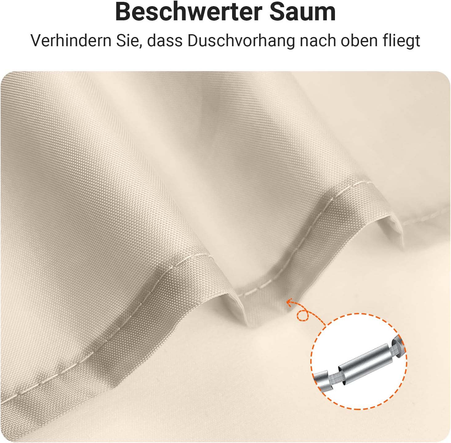 • Лесен монтаж: Тази завеса за душ е снабдена с 12 пластмасови кукички, включените кукички позволяват лесно окачване на тази завеса за баня. Долен подгъв с тежести: Допълнителен шев с надеждно закрепен подгъв в долната част. Включете струята под високо налягане. Предотвратете залепването на завесата за баня по тялото ви, когато се къпете.
