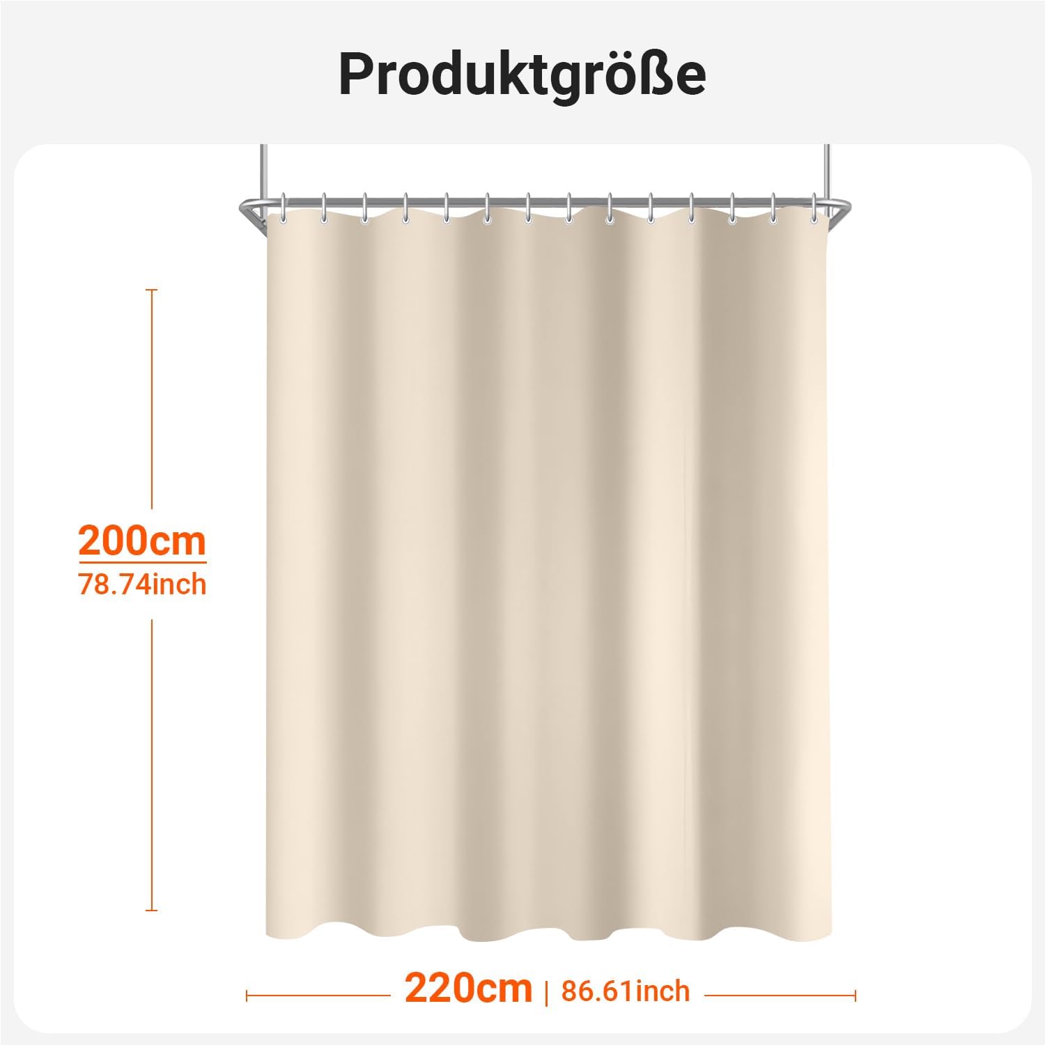 Завеса за душ, 220 x 200 см, бежова, утежнен подгъв, текстил против мухъл, водоотблъскващ, полиестерна материя, която може да се пере, завеса за баня, вана с 12 халки за завеса за душ