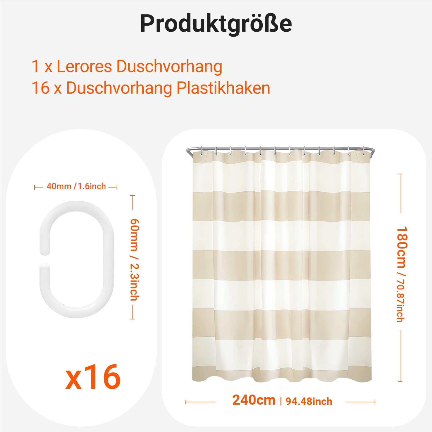 Завеса за душ, 240 x 180 см, бежови райета, утежнен подгъв, текстил против мухъл, водоотблъскващ, перащи се полиестерни завеси за баня с капси и 12 халки за душ за баня, вана