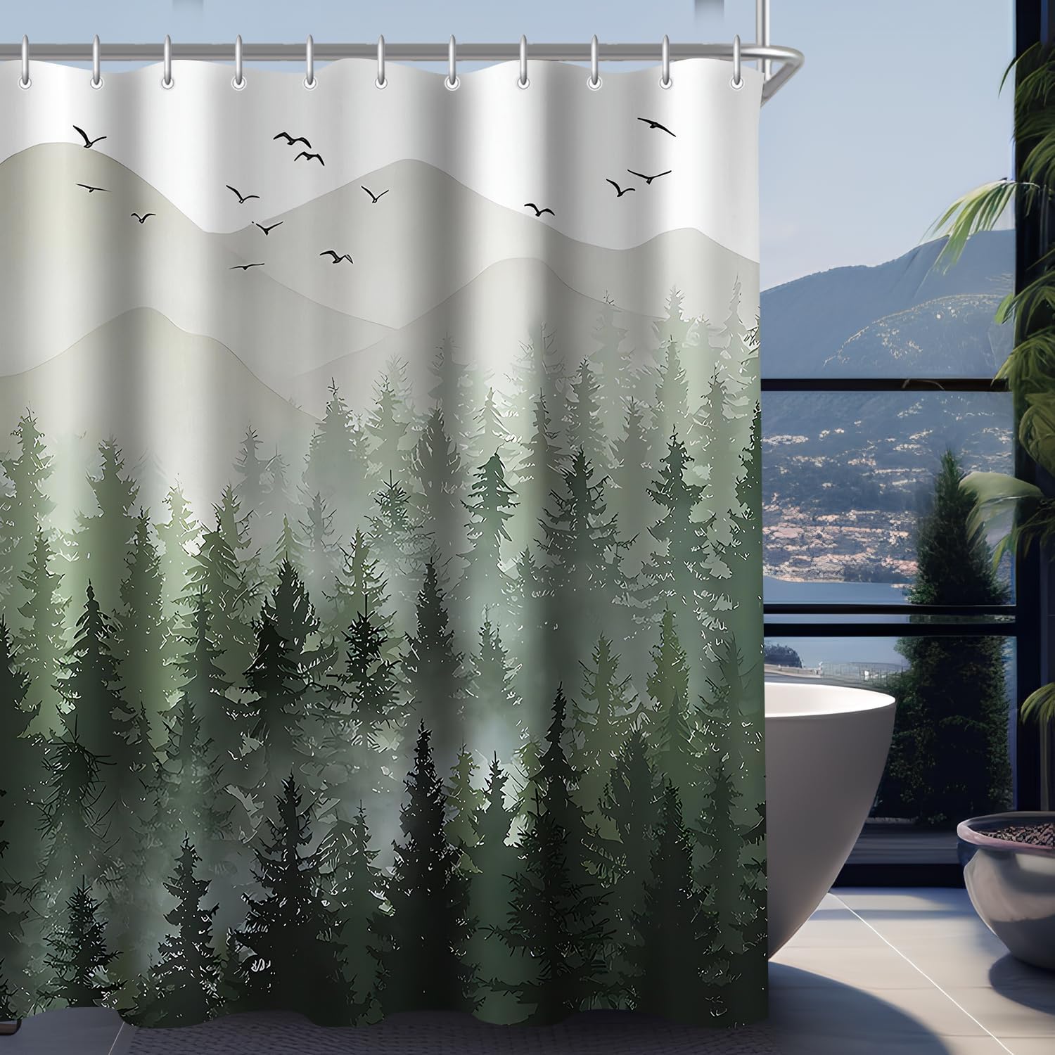 Завеса за душ 240 x 180 см, гора, текстил против мухъл, утежнен подгъв, водоотблъскваща, переща се полиестерна материя, 16 завеси за баня с капси и халки за душ, за баня, вана