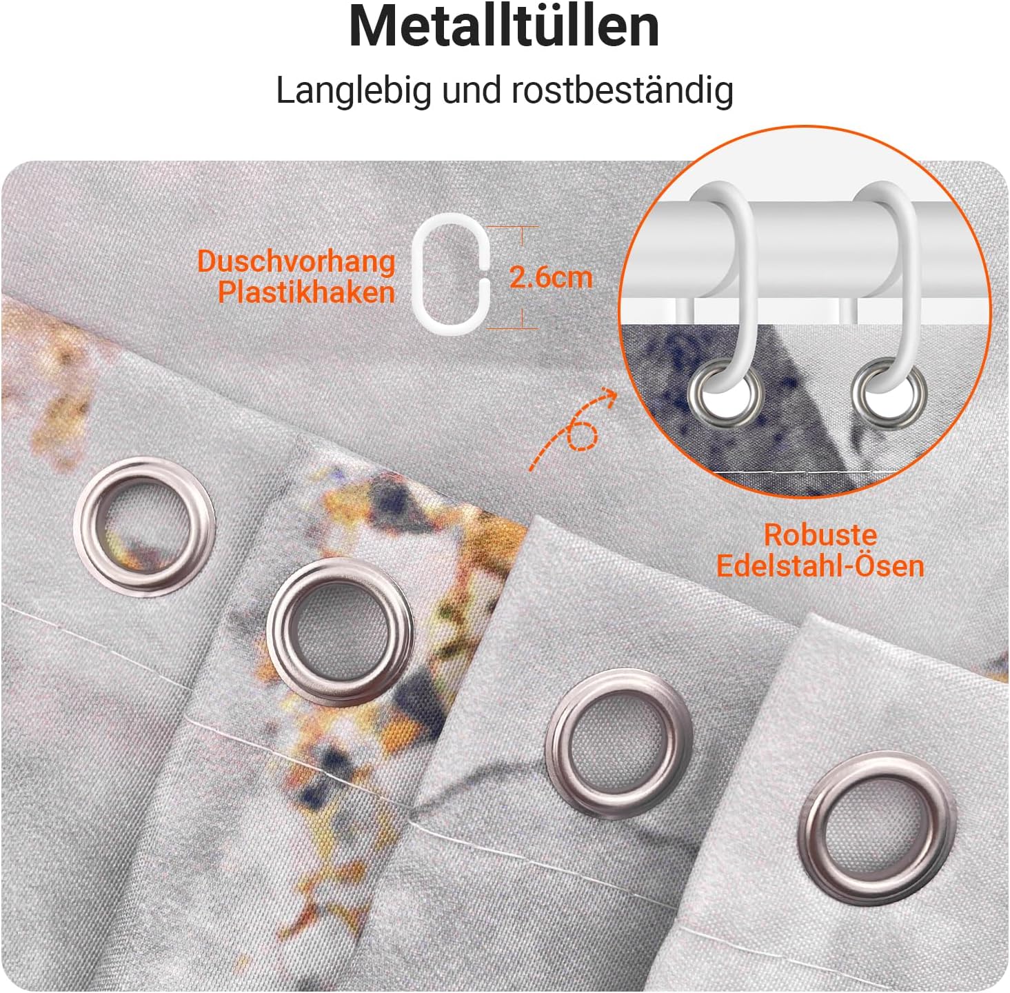 • Лесен монтаж: Тази завеса за душ е снабдена с 12 пластмасови кукички, включените кукички позволяват лесно окачване на тази завеса за баня. Долен подгъв с тежести: Допълнителен шев с надеждно закрепен подгъв в долната част. Включете струята под високо налягане. Предотвратете залепването на завесата за баня по тялото ви, когато се къпете.