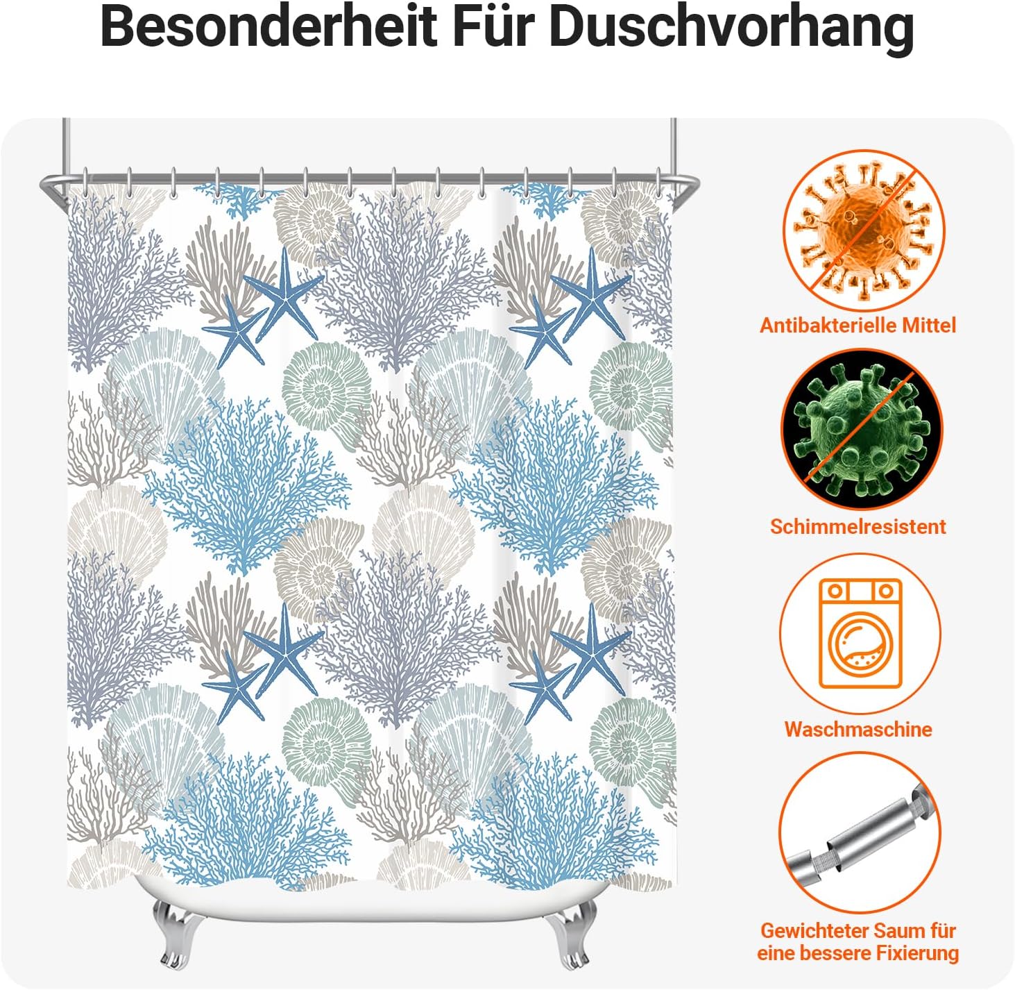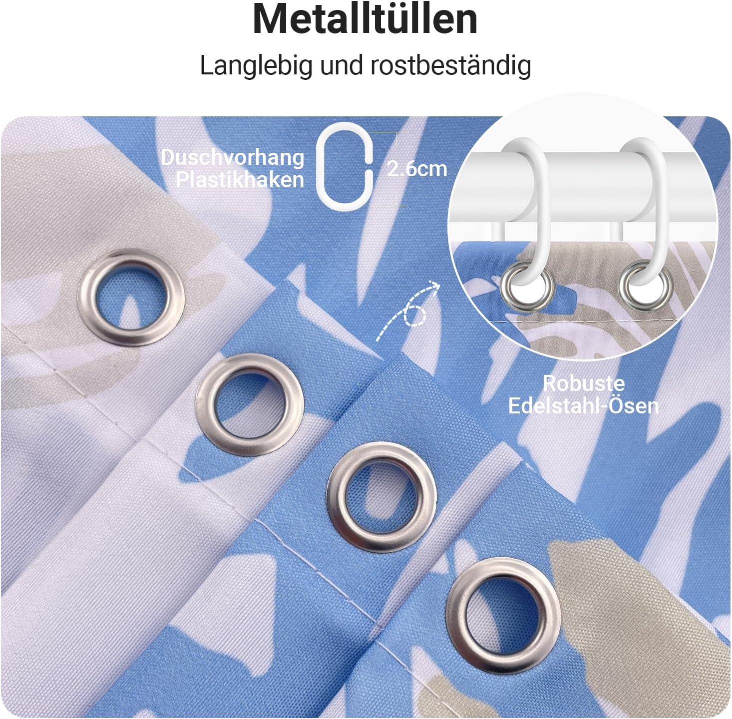 • Лесен монтаж: Тази завеса за душ е снабдена с 12 пластмасови кукички, включените кукички позволяват лесно окачване на тази завеса за баня. Долен подгъв с тежести: Допълнителен шев с надеждно закрепен подгъв в долната част. Включете струята под високо налягане. Предотвратете залепването на завесата за баня по тялото ви, когато се къпете.