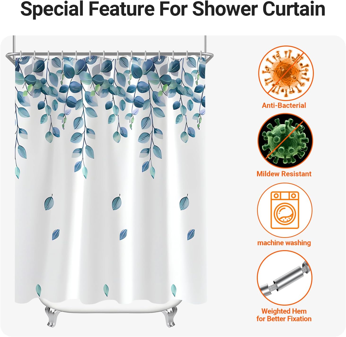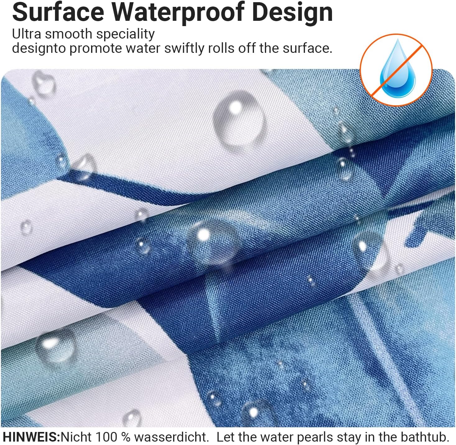 • Противомушълно и водоустойчиво покритие: Ултрагладък специален дизайн, създаден да устои на вода и да насърчава образуването на водни капчици, водата може лесно да се образува върху завесата за душ. За да предотвратите образуването на мухъл, уверете се, че водните капчици остават във ваната. Не е 100% водоустойчиво.