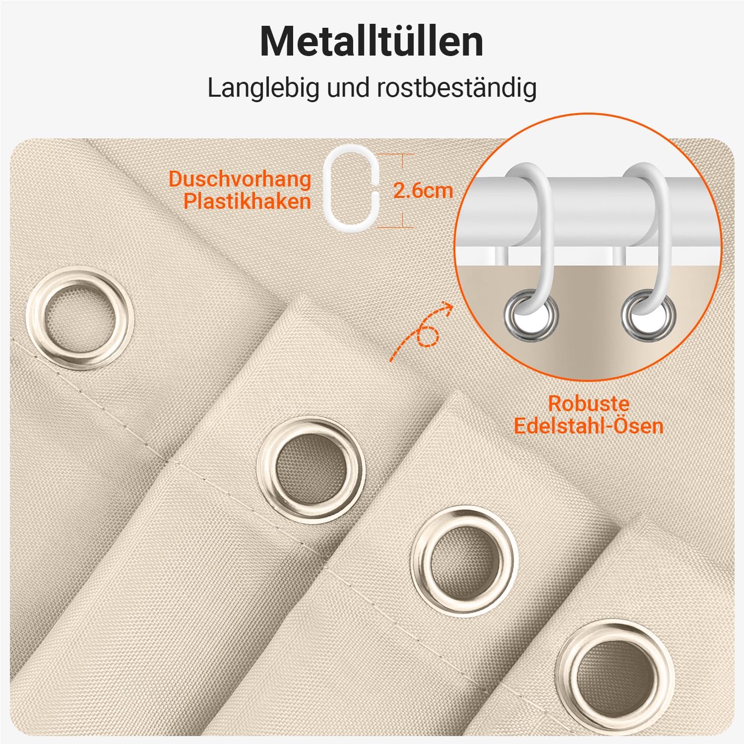 • Лесен монтаж: Тази завеса за душ е снабдена с 12 пластмасови кукички, включените кукички позволяват лесно окачване на тази завеса за баня. Долен подгъв с тежести: Допълнителен шев с надеждно закрепен подгъв в долната част. Включете струята под високо налягане. Предотвратете залепването на завесата за баня по тялото ви, когато се къпете.