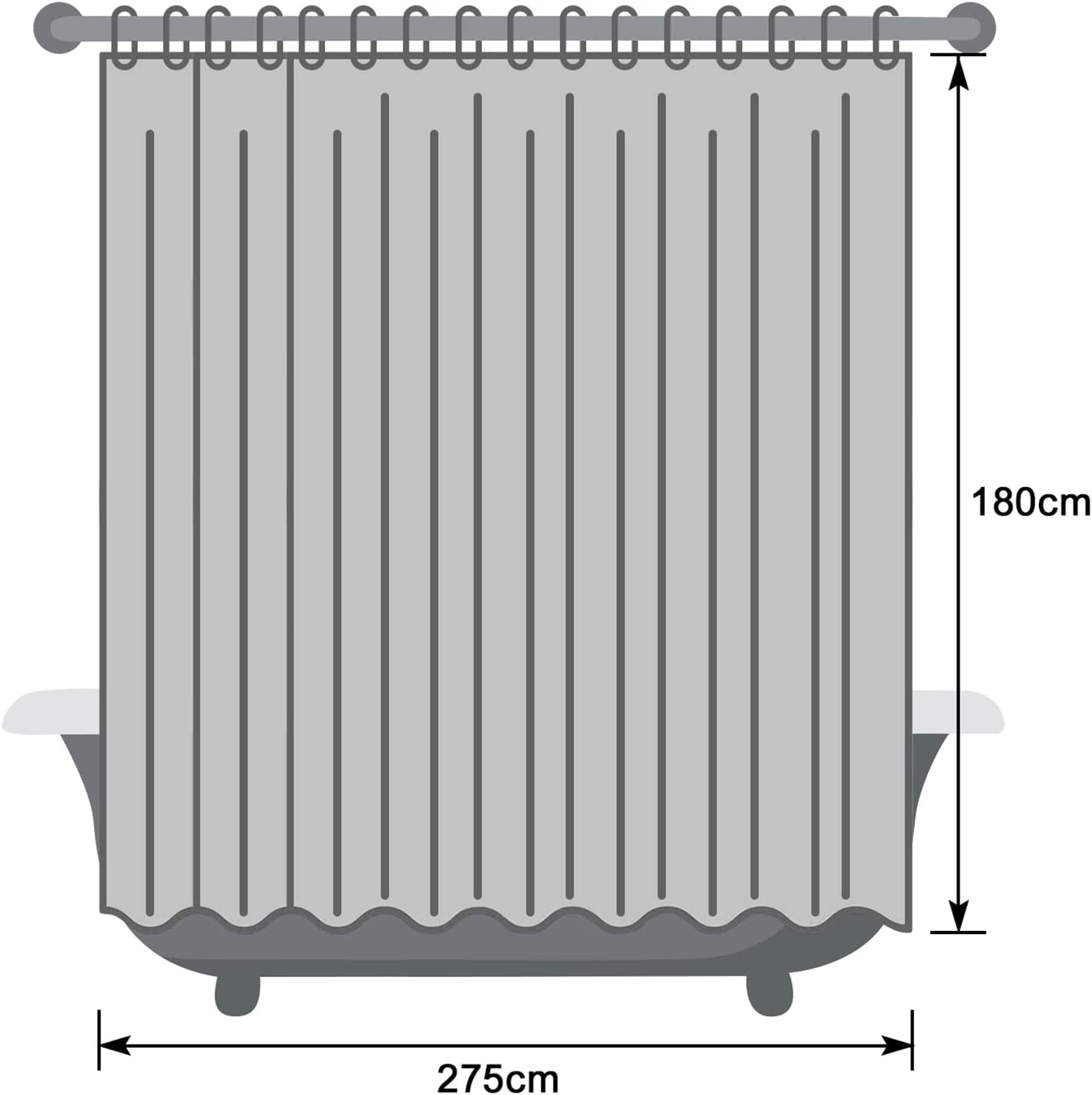 • Изключително широка завеса за душ: 275 см ширина, 180 см височина с 18 метални капси и 18 бели пластмасови кукички.