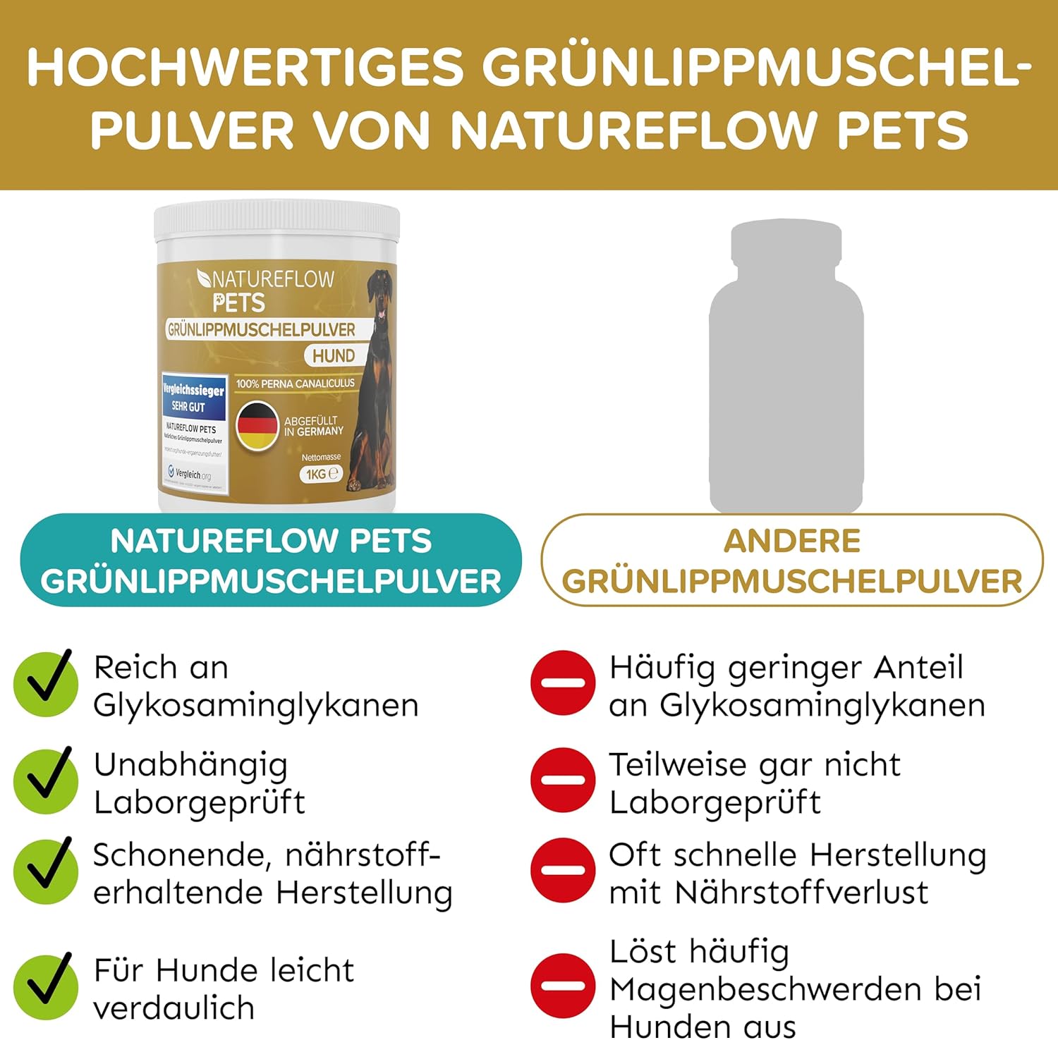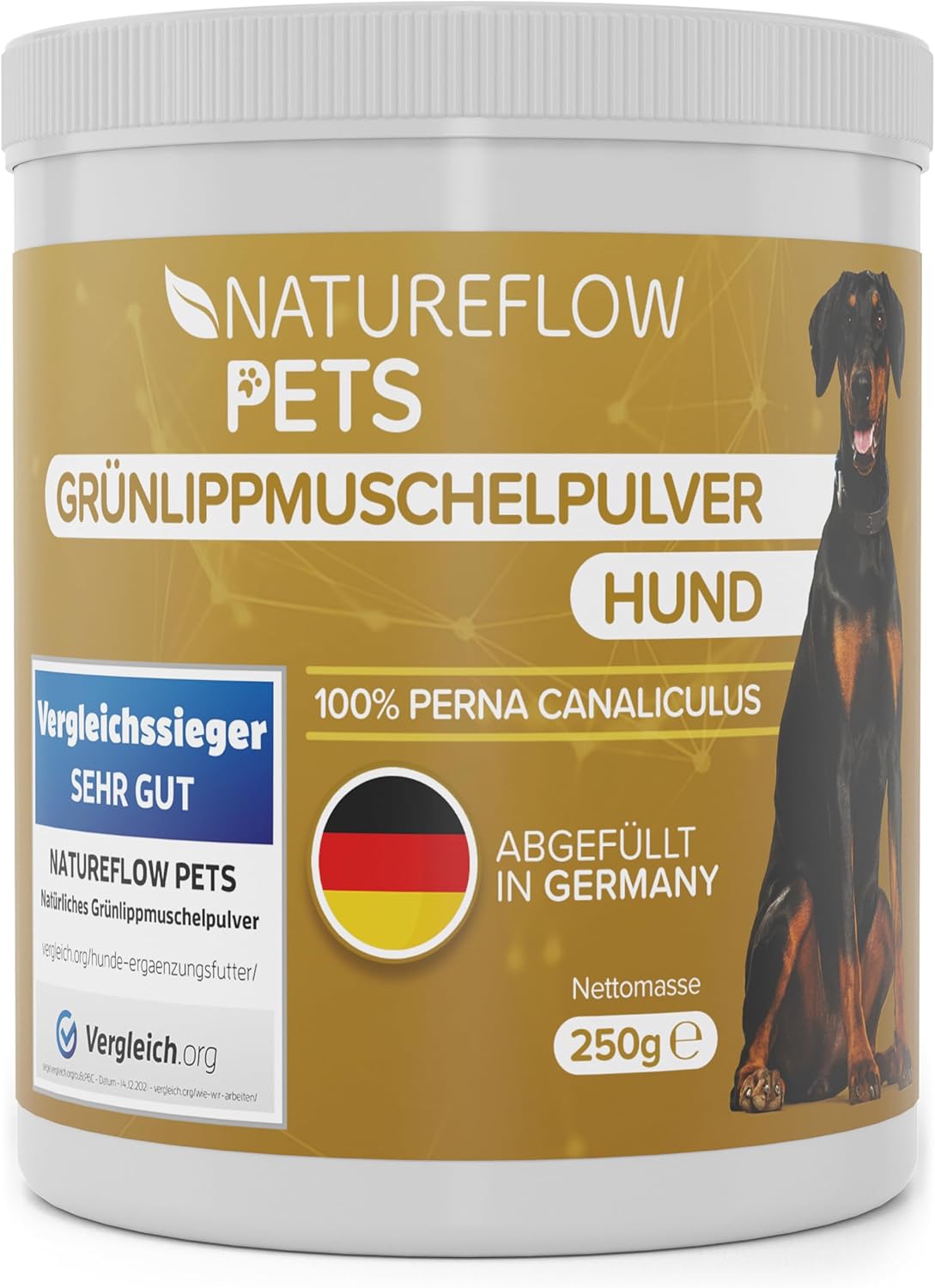 Състав: 100% Perna canaliculus (чисто новозеландско мидено брашно), смляно и лиофилизирано. Аналитични съставки и нива: Суров протеин: 52%; Сурови мазнини: 6,2%; Гликозаминогликани: мин. 2%. Еднократна храна за кучета. Препоръка за хранене: Смесете праха с храната веднъж дневно, 2,5 г на 10 кг телесно тегло дневно. За аклиматизация, започнете с 50% от препоръчителната дневна доза в продължение на 3 до 5 дни. 1 лъжичка = 7 г. Съхранявайте на хладно и сухо място, защитено от атмосферните влияния.