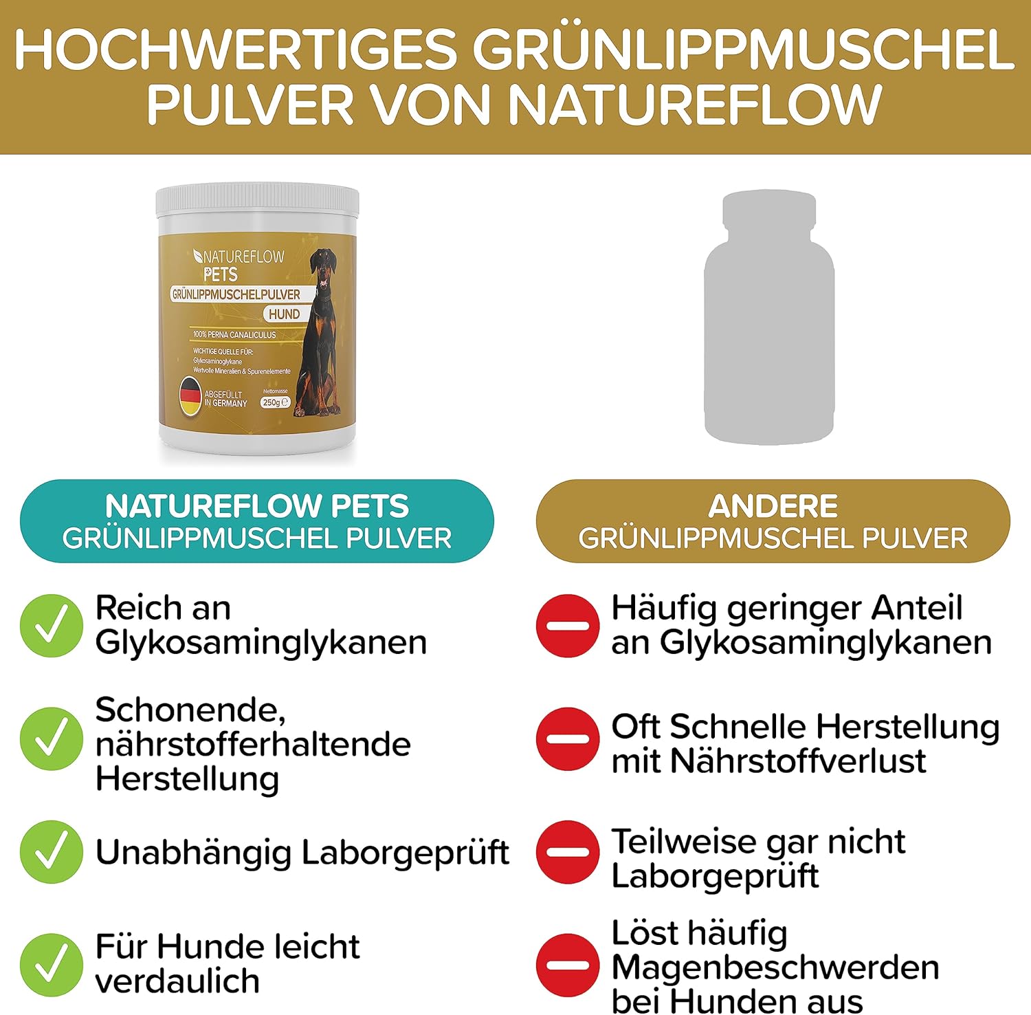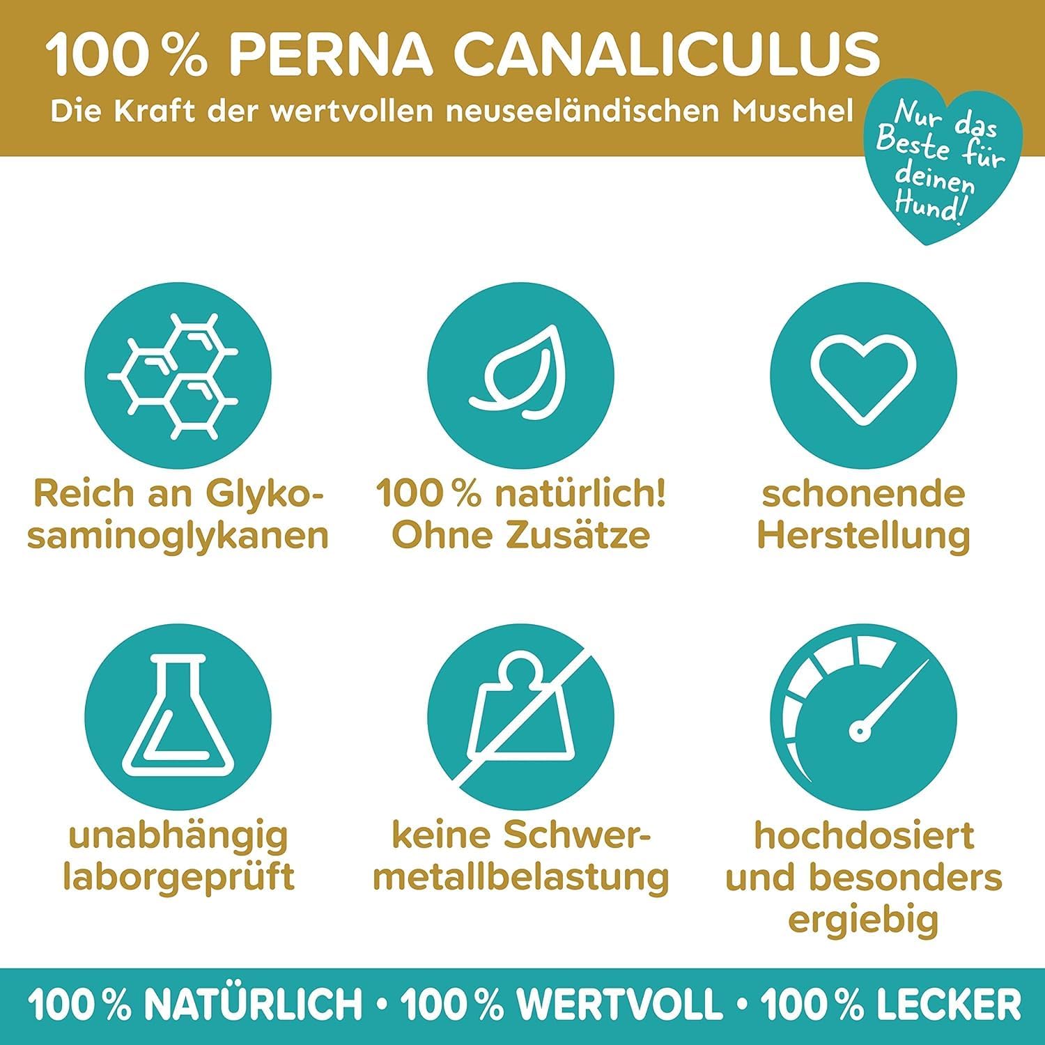 Състав: 100% Perna canaliculus (чисто новозеландско мидено брашно), смляно и лиофилизирано. Аналитични съставки и нива: Суров протеин: 52%; Сурови мазнини: 6,2%; Гликозаминогликани: мин. 2%. Еднократна храна за кучета. Препоръка за хранене: Смесете праха с храната веднъж дневно, 2,5 г на 10 кг телесно тегло дневно. За аклиматизация, започнете с 50% от препоръчителната дневна доза в продължение на 3 до 5 дни. 1 лъжичка = 7 г. Съхранявайте на хладно и сухо място, защитено от атмосферните влияния.