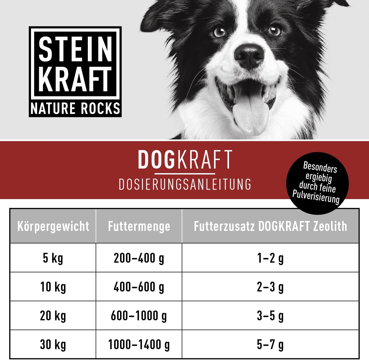 Смесете максимум 1% (10 г/кг) с общата дажба (пълноценна храна). Осигурете на кучето достъп до много прясна питейна вода.
