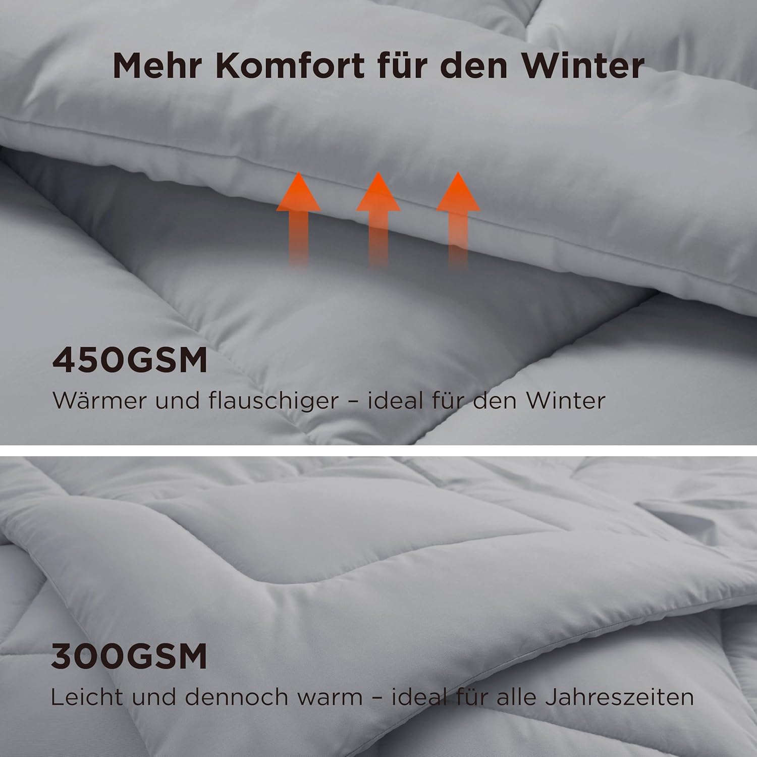 Насладете се на спокоен сън и се чувствайте комфортно през целия сезон с одеялото Bedsure 4 Seasons. Нашето одеяло е декорирано с красиви шарки във формата на кутия и ще добави лукс към вашата спалня на хотелско ниво. Одеялото е завършено с зашити шевове тип „кутия“ и предпазва пълнежа от хлъзгане, за да осигури равномерно покритие и топлина всяка вечер. Универсално се използва като две отделни завивки или като зимно одеяло. Одеялото от 100% микрофибър е пълнено с пълнеж от 300 г/м² и 150 г/м² и е отлична алтернатива на конвенционалните пухени завивки за хора с чувствителност към гъши или патешки пух. 8 копчета мигновено комбинират двете единични завивки в дебело, уютно одеяло, за да оцелеете през студената зима. Нашата класическа чисто бяла завивка ви кани в стая с изискана декорация и ще повярвате, че спите в облак по всяко време на годината.