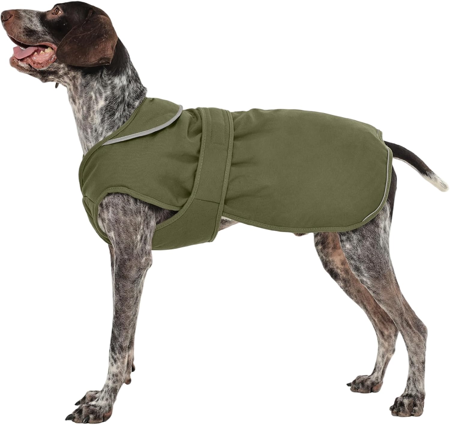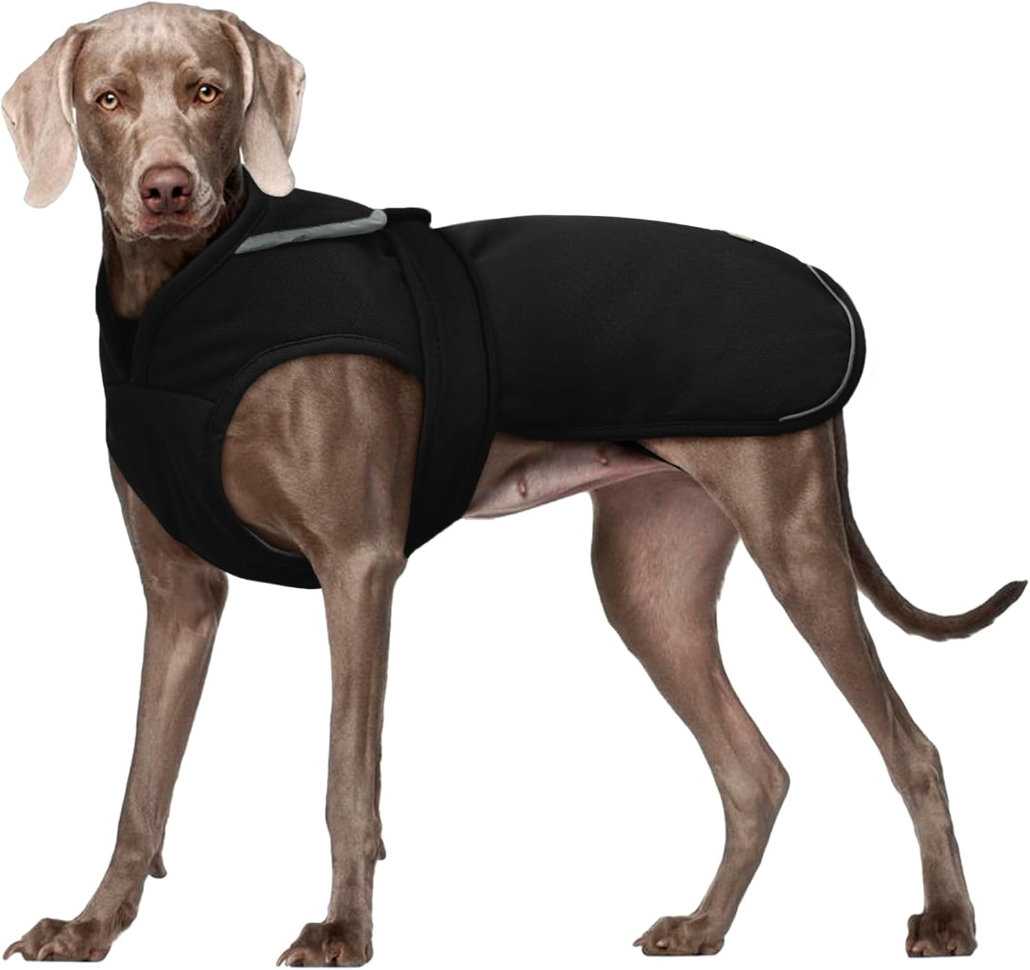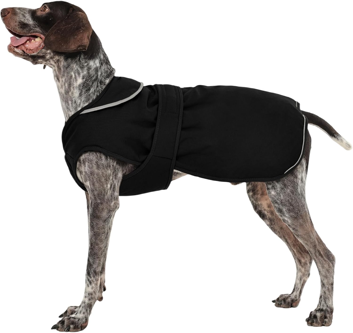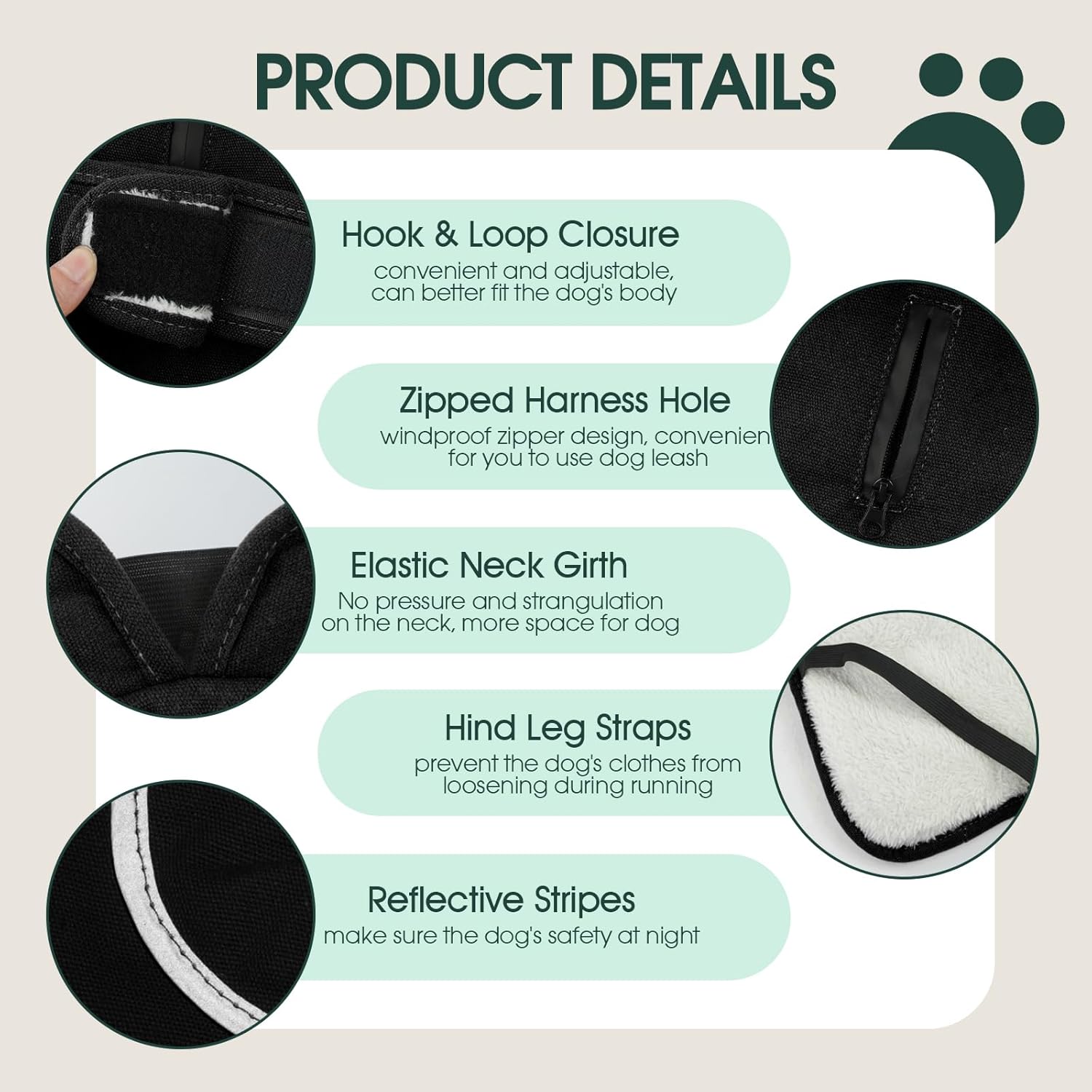 Material: 100% cotton + fleece, warm and comfortable. Water resistant fabric on one side for walking on rainy and snowy days. Easy Velcro closure. Easy to put on and take offHole for collar and harnessReflective tape on neck and back for good visibility