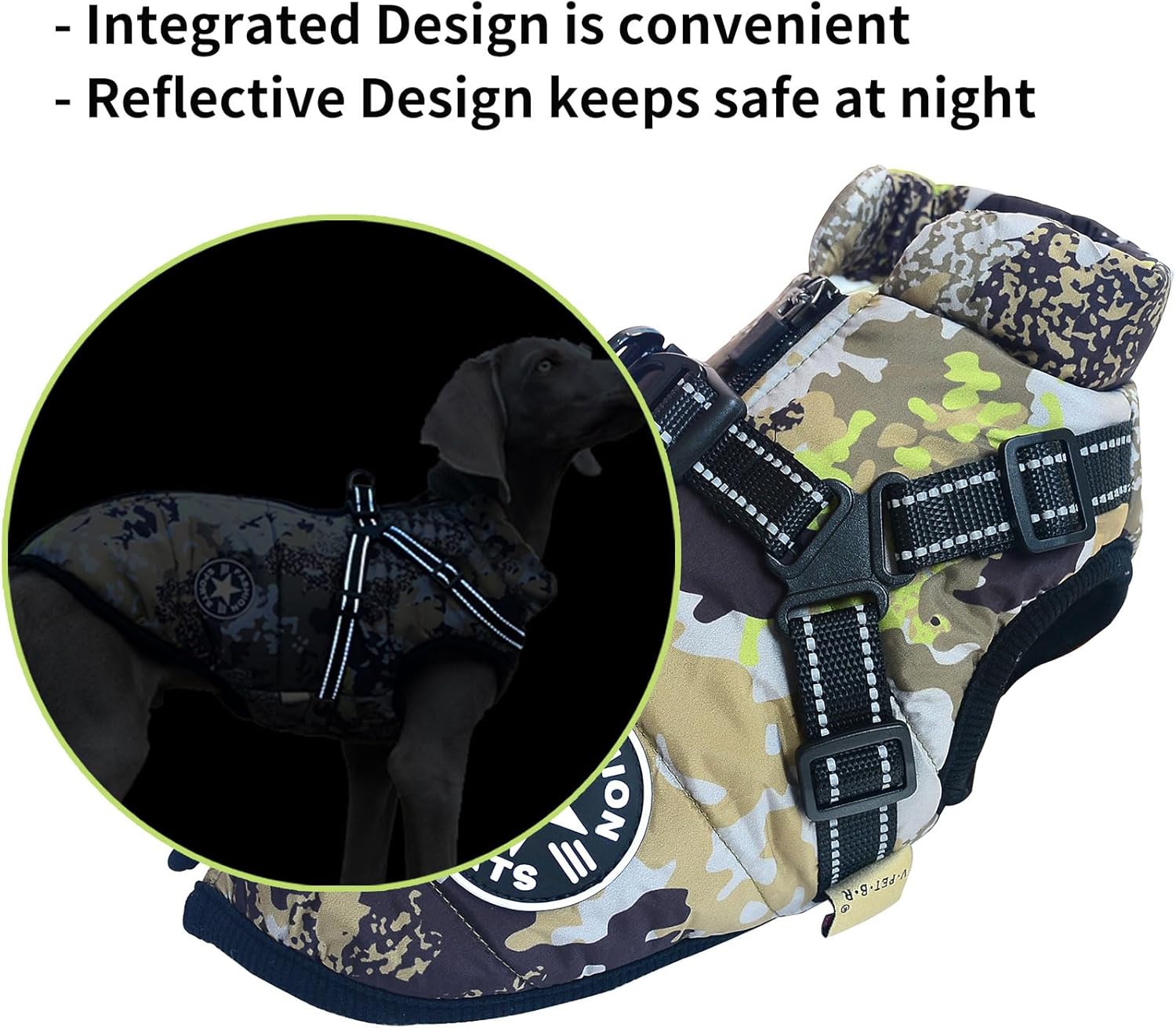 Цип на гърба, лесно обличане и събличане. Защита с цип, предпазва козината на вашия домашен любимец. Светлоотразителна лента, безопасна през нощта. Водоотблъскващ материал, идеален за дъждовни/снежни дни. Топла и мека поларена подплата отвътре.