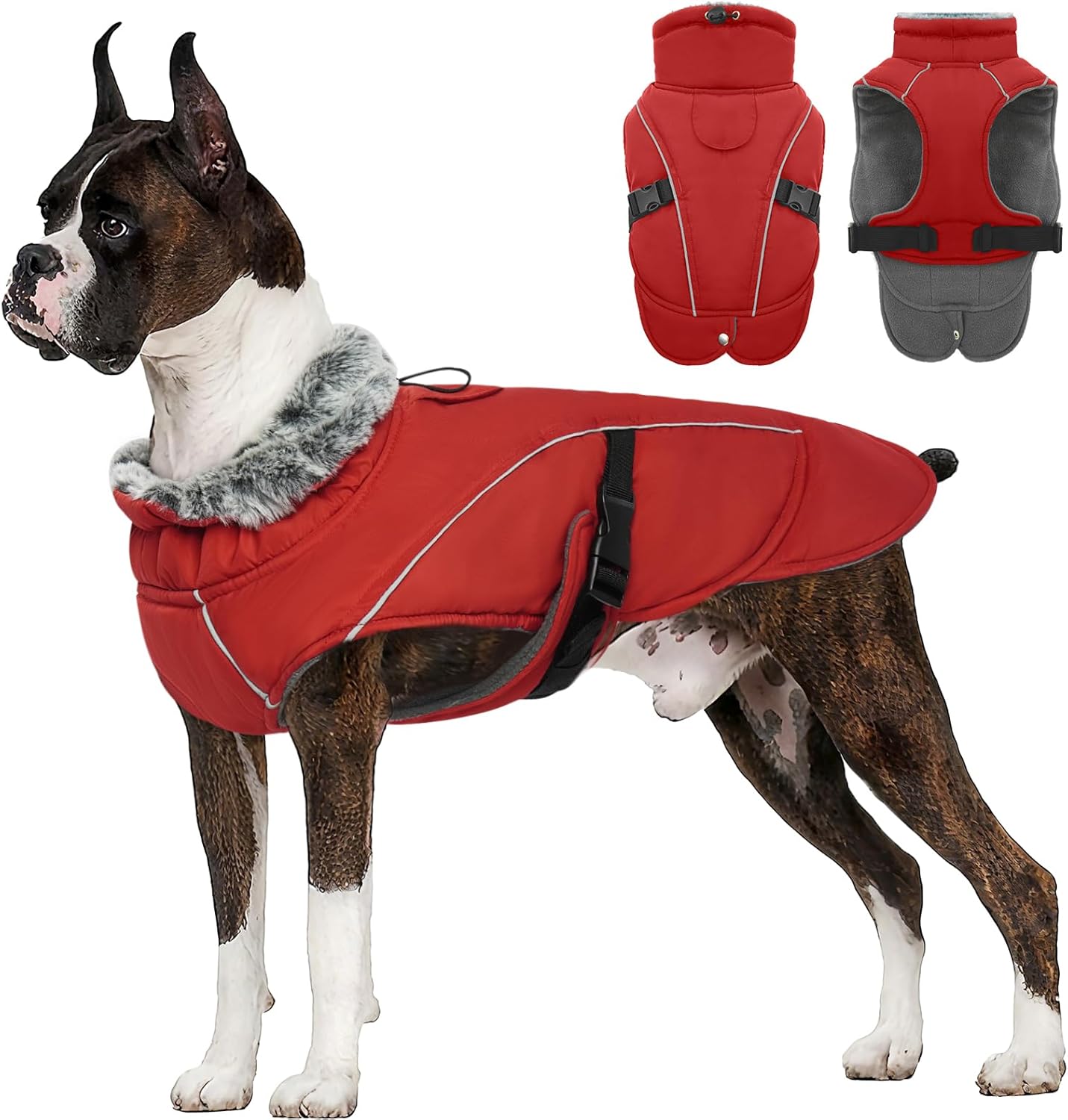 Топло и водоустойчиво: Зимното яке за кучета е изработено от водоотблъскващ външен материал и вътрешен слой от полар и поддържа вашите домашни любимци сухи и топли. Кожена яка - Водоустойчивият зимен дизайн на яке за кучета със супер топла поларена яка за врата, която може да се регулира с връзка за стягане и може да се настройва и сваля, ако е необходимо. Светлоотразителни ленти - Топлият жилет за кучета е ушит със светлоотразителни ленти, за да направи кучето ви по-видимо и безопасно през нощта. Лесно обличане и сваляне - Регулируемата катарама на поларното яке за кучета позволява бързо фиксиране, което може да се регулира, за да приляга по-добре около областта на гърдите. Отвор за каишка - Има скрит отвор за каишка, където каишката за куче може да се прикрепи към якето.