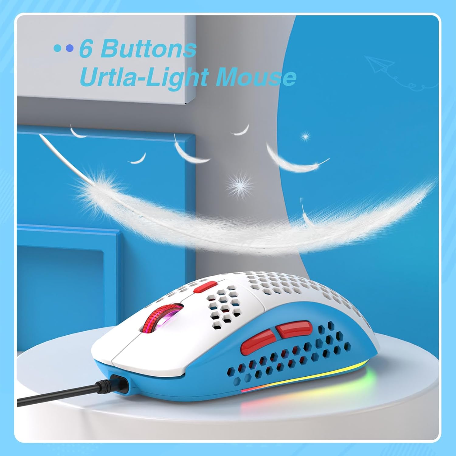 • Ултралека оптична мишка с 6400 DPI тип „пчелна пита“: дизайн с обвивка тип „пчелна пита“, най-леката геймърска мишка, с ултрагъвкав, оплетен кабел, който съчетава производителност и издръжливост, тя е перфектната геймърска мишка за компютър. С до 6400 DPI, 6 програмируеми макро бутона, тази RGB осветена мишка е създадена за скорост, контрол и удобство за най-добро гейминг изживяване.