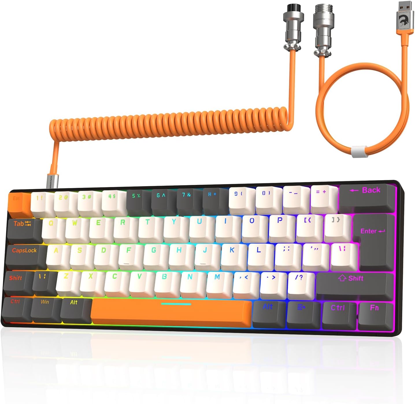 ZIYOU LANG Геймърска клавиатура и мишка с кабел и спирален USB-C кабел T60 Pro - компактна механична клавиатура с кафяви превключватели, 6400DPI ултра леки RGB мишки за PC/Mac - цвят млечен чай