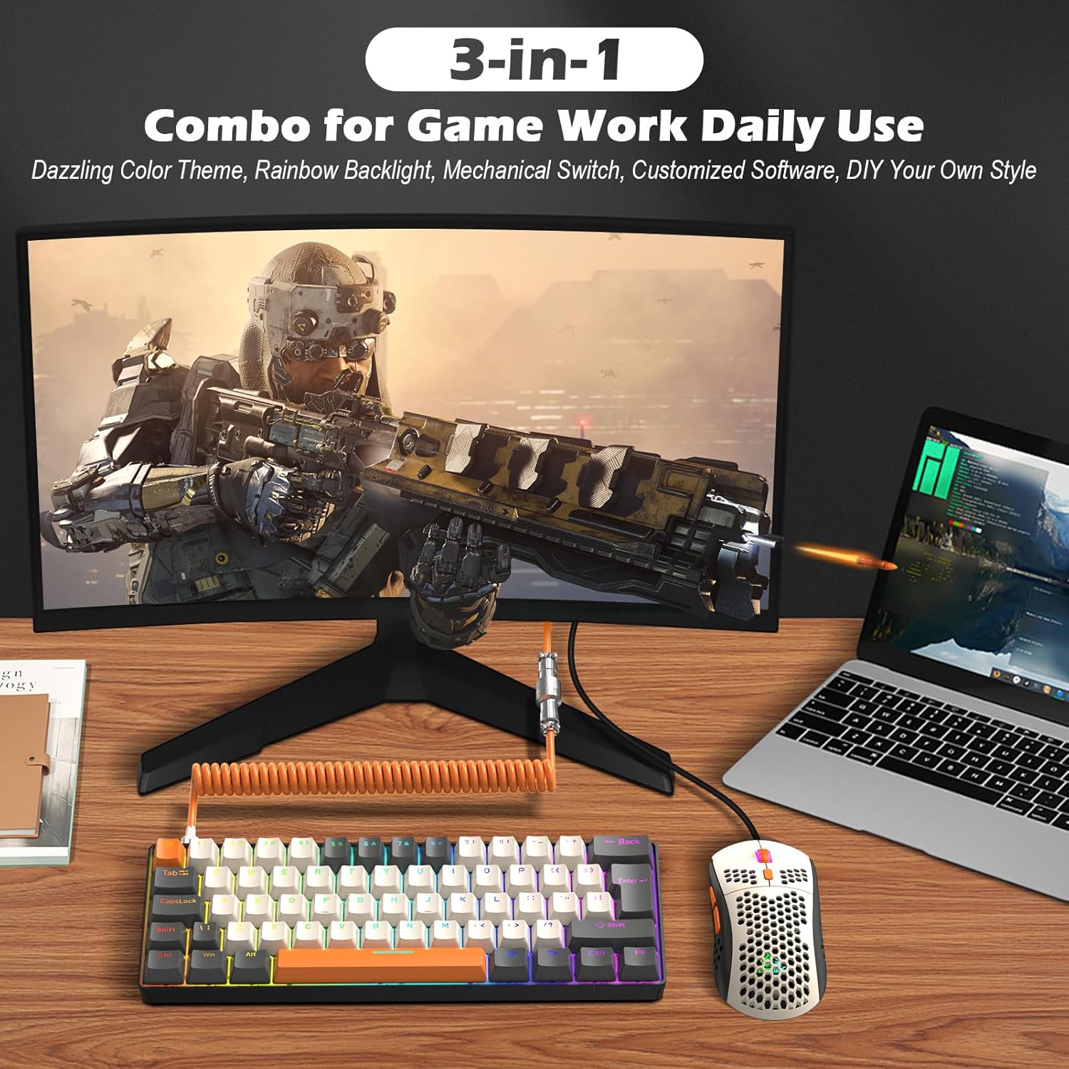 Компактна 60% лека механична клавиатура, 6400 DPI, лека геймърска мишка с цвят Honeycomb RGB + професионален персонализиран USB-C кабел за клавиатура