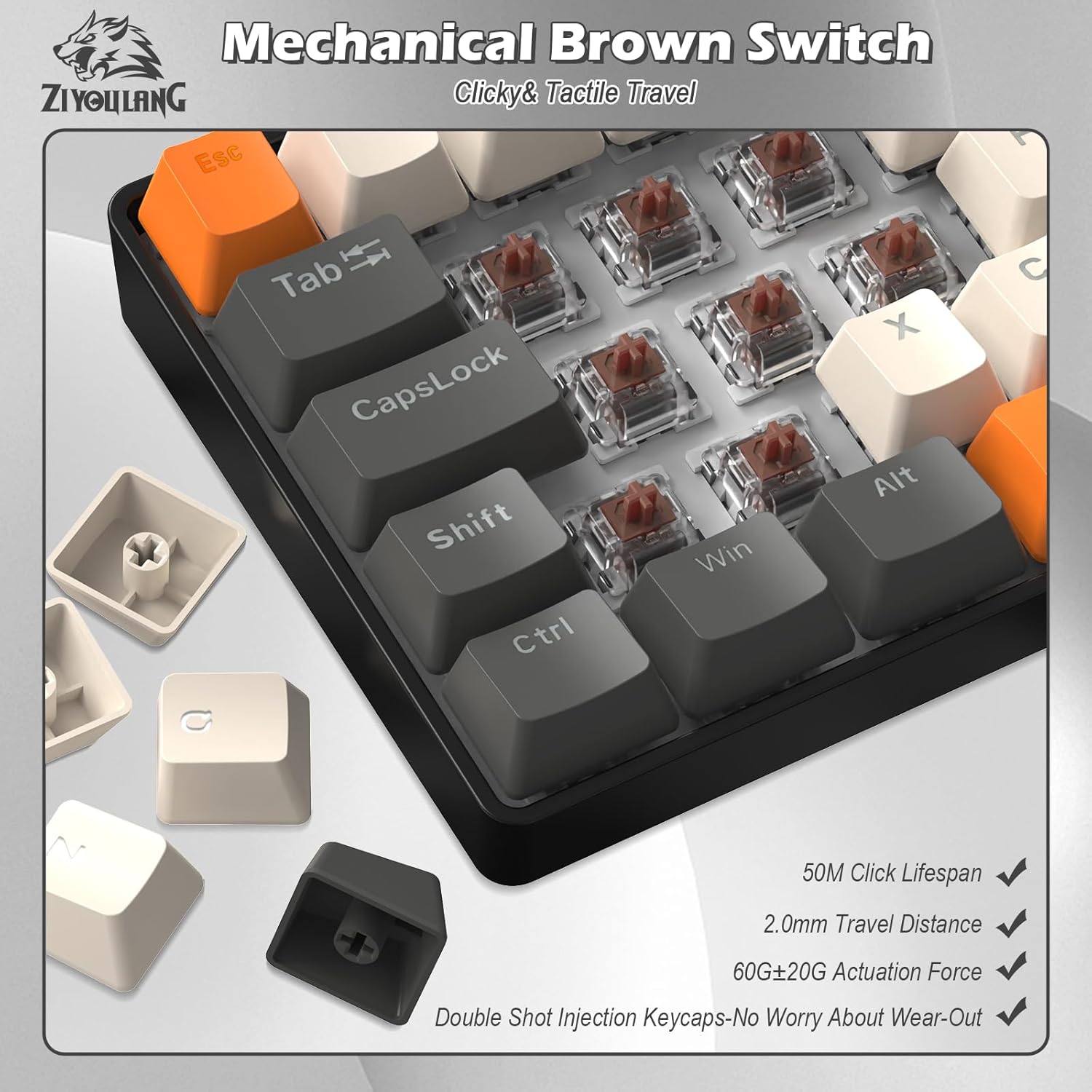 • Миниатюрна компактна 62-клавиатура: ZIYOU LANG T60 Pro е преносима и компактна 60% механична клавиатура с малък размер, която спестява място на бюрото. Тя може да отговори на вашите нужди в офиса или у дома. Маслоустойчивите ABS капачки на клавишите с двоен слой имат по-издръжлива матова повърхност, която не се натрупва лесно за дълго време, а клавишите имат силно светлопропускливо покритие.