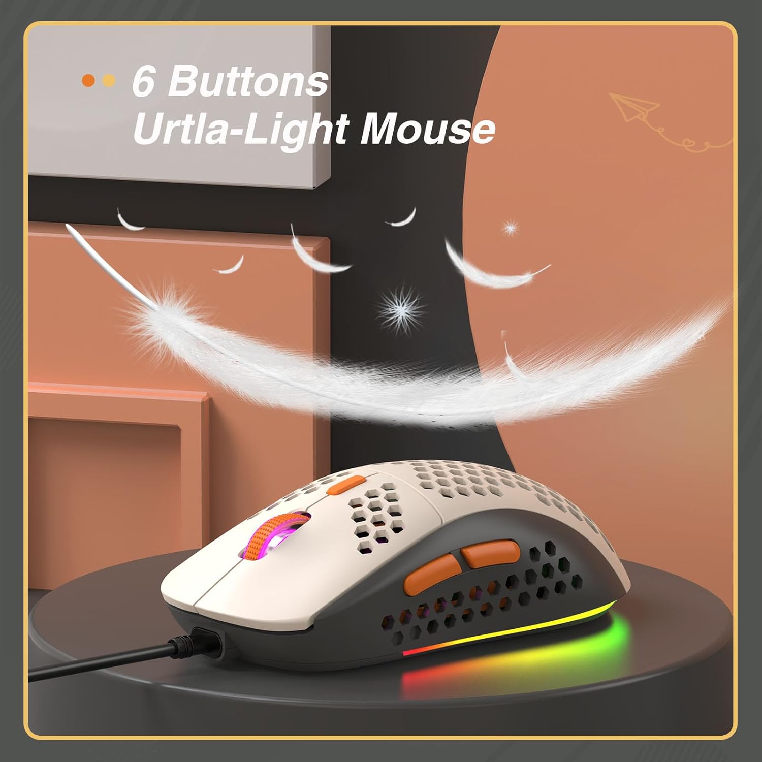 • Ултралека оптична мишка с 6400 DPI тип „пчелна пита“: дизайн с обвивка тип „пчелна пита“, най-леката геймърска мишка, с ултрагъвкав, оплетен кабел, който съчетава производителност и издръжливост, тя е перфектната геймърска мишка за компютър. С до 6400 DPI, 6 програмируеми макро бутона, тази RGB осветена мишка е създадена за скорост, контрол и удобство за най-добро гейминг изживяване.