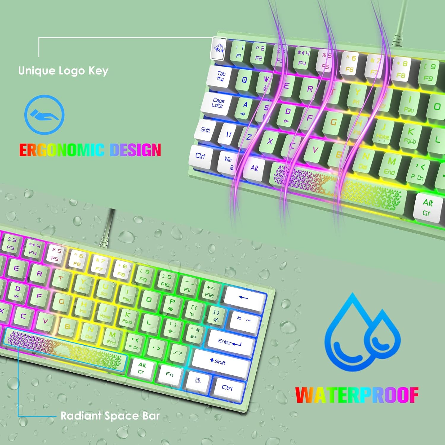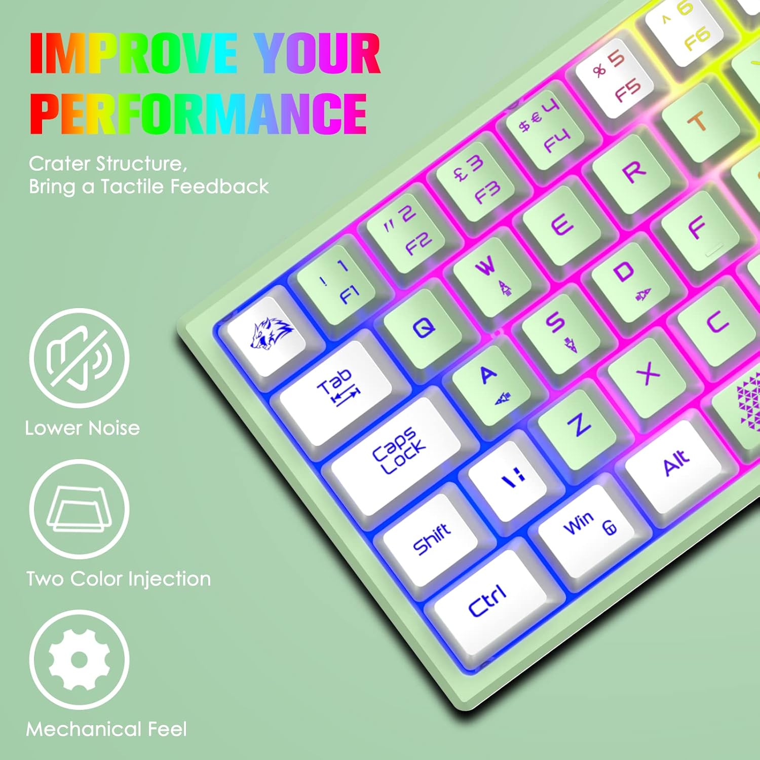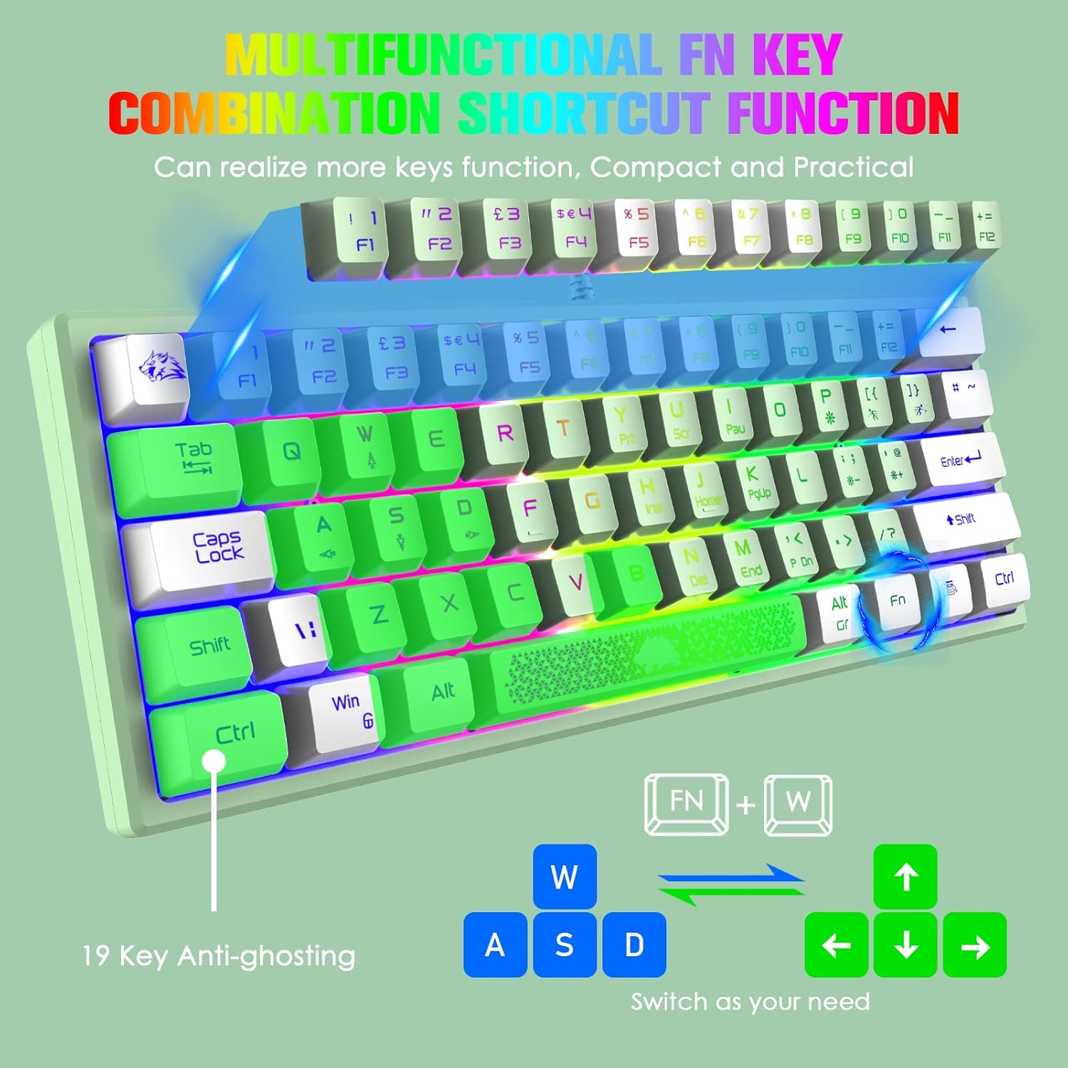 • 60% геймърска клавиатура: Мини компактна 62-клавиша, малък размер и големи функции. Компресира формата с 60%, без да прави компромис с функционалността на клавиатурата. Размерът е само 11,8 x 4,3 x 1,2 инча, може лесно да се инсталира дори в най-тясното пространство, осигурявайки ви комфортно гейминг изживяване.