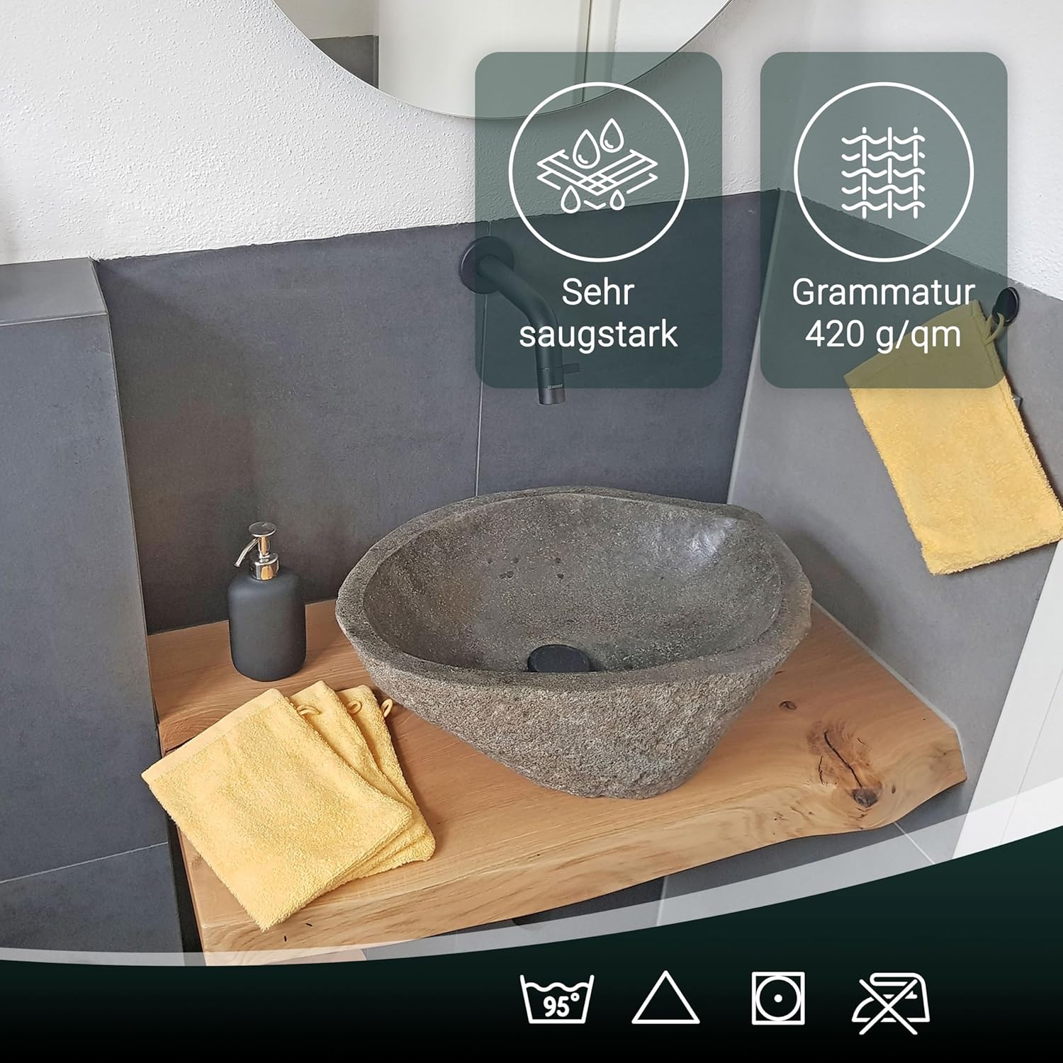Индантреновият цвят гарантира на кърпите за гости най-високи стойности за устойчивост на цветовете и най-добра стабилност на цветовете, те могат да се перат до 95°C и дори са устойчиви на варене и хлор.