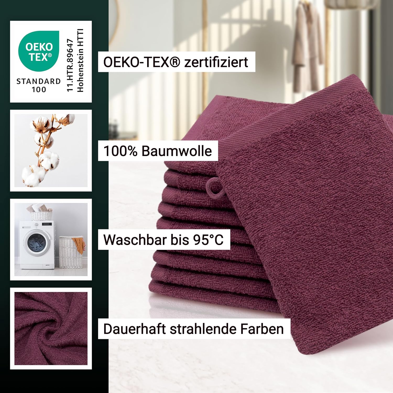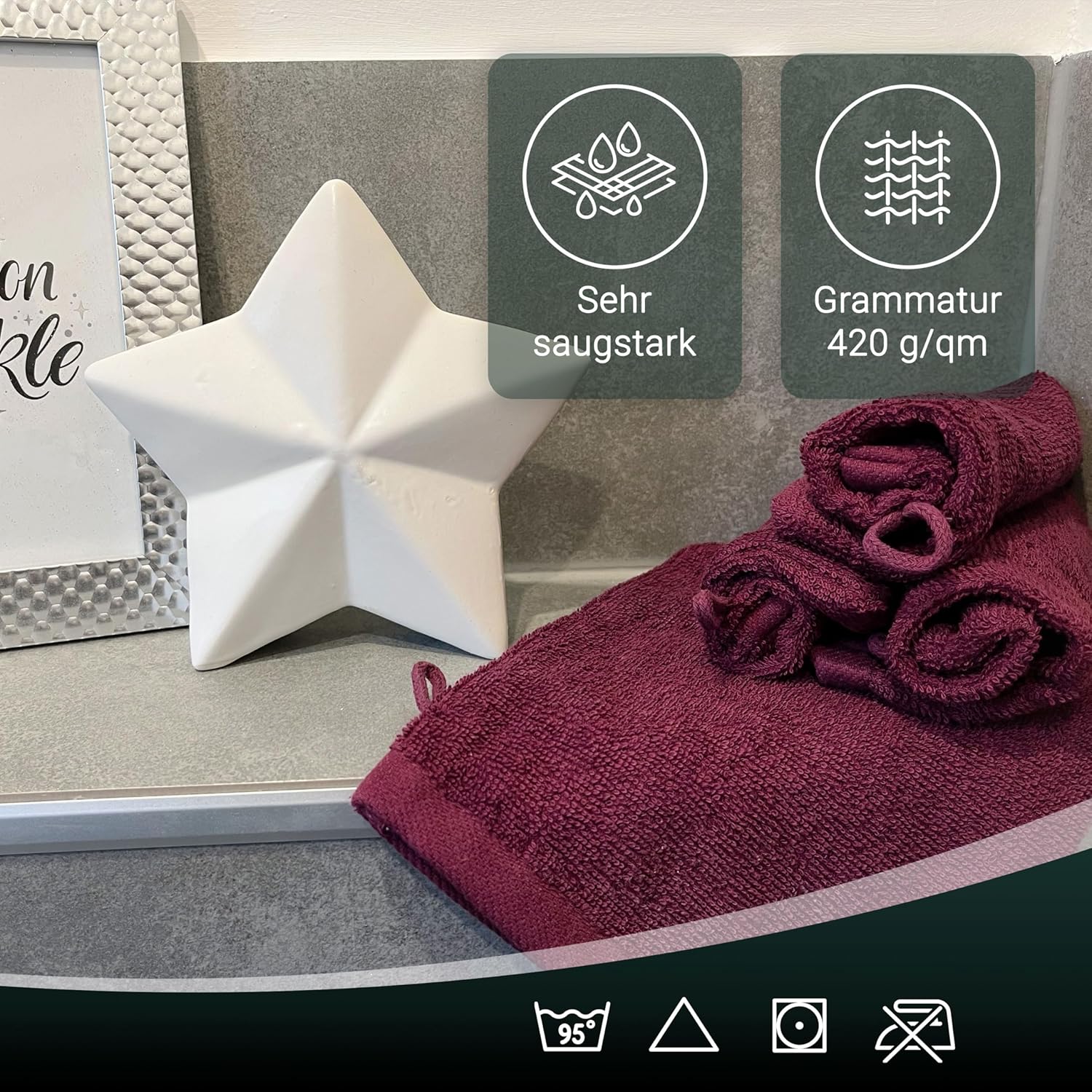 Абсорбиращите постелки за баня впечатляват с най-високата си устойчивост на цветовете. Благодарение на боядисването с индантрен, хавлиените кърпи постигат най-високи стойности за устойчивост на цветовете и най-добра стабилност на цветовете, могат да се перат до 95°C и дори са устойчиви на кипене и хлор.