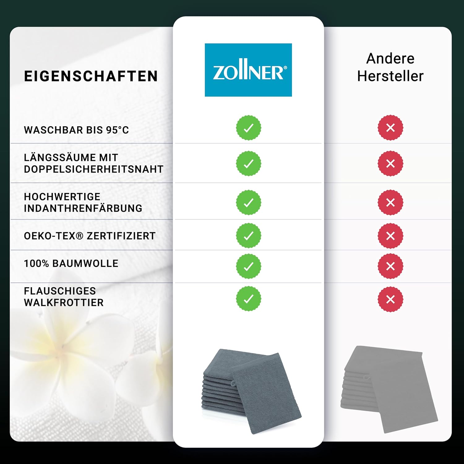 Благодарение на липсата на бордюр, се осигурява трайно стабилна форма на кърпите за гости.