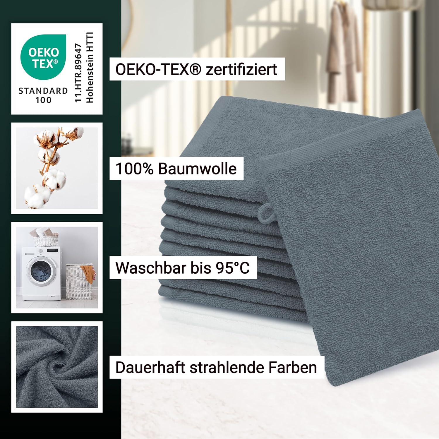 Индантреновият цвят гарантира на кърпите за гости най-високи стойности за устойчивост на цветовете и най-добра стабилност на цветовете, те могат да се перат до 95°C и дори са устойчиви на варене и хлор.