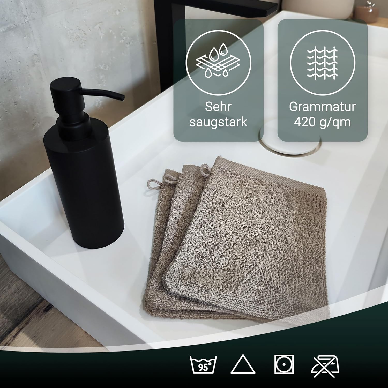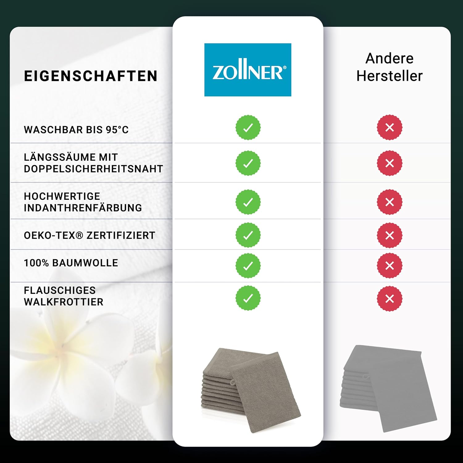 Благодарение на липсата на бордюр, се осигурява трайно стабилна форма на кърпите за гости.