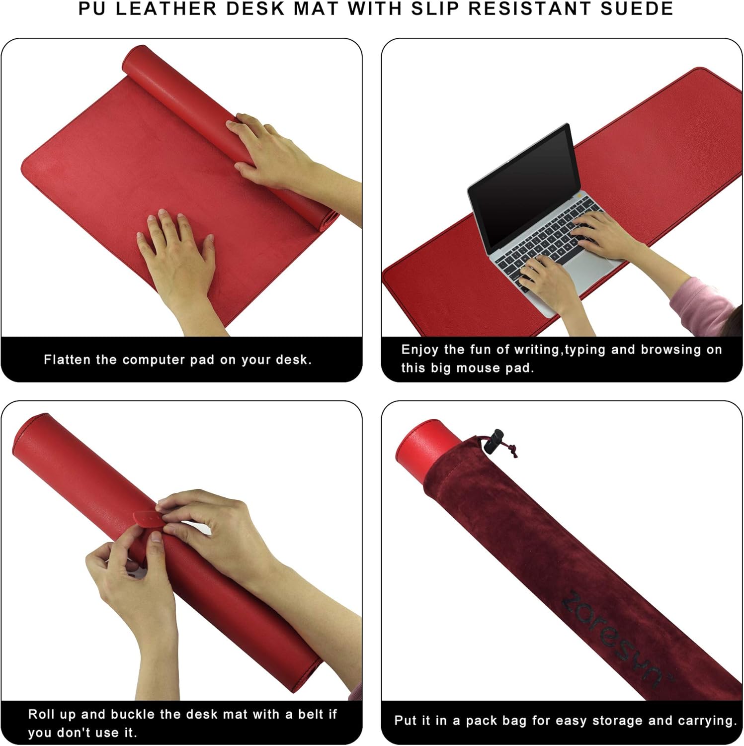 • Изключително широка постелка с размери 110 x 50 см покрива цялото бюро. Лесна за навиване с включена кожена каишка - идеална за пътуване или за пестене на място при съхранение.